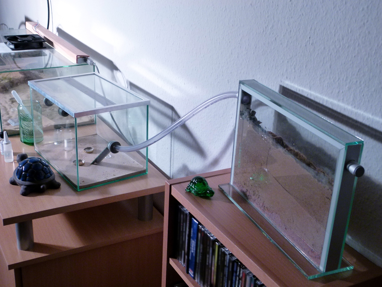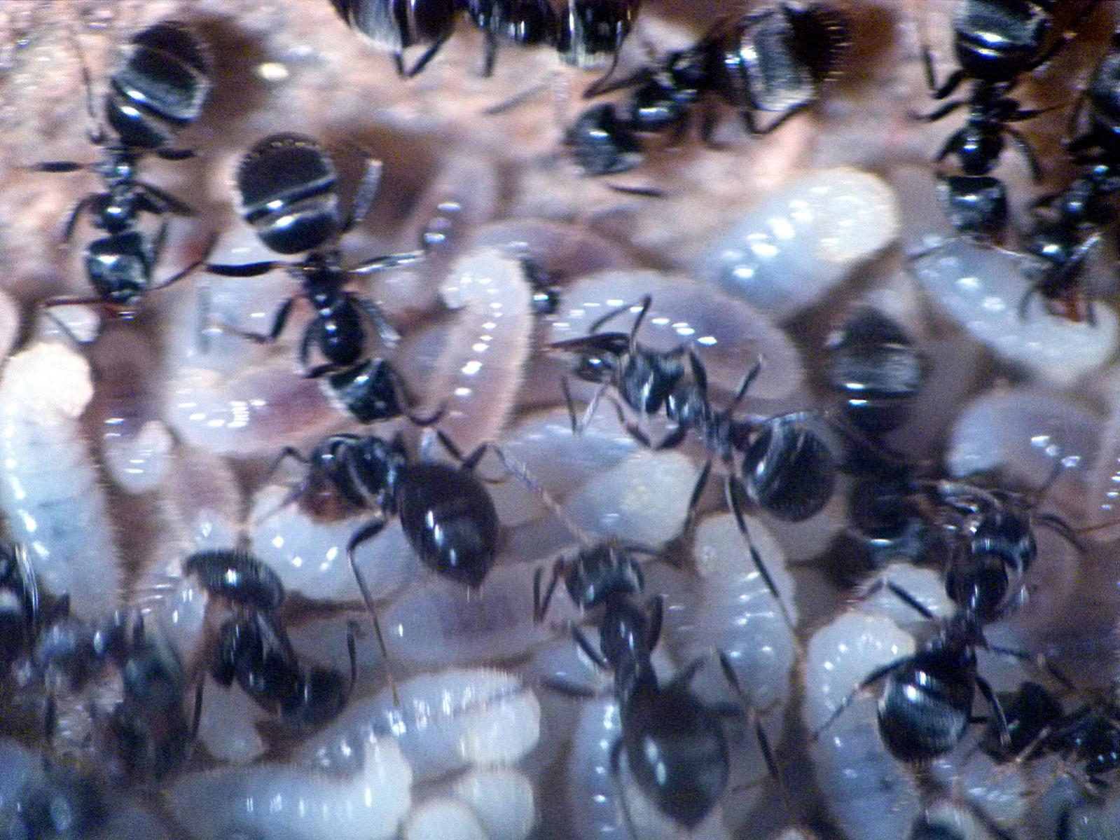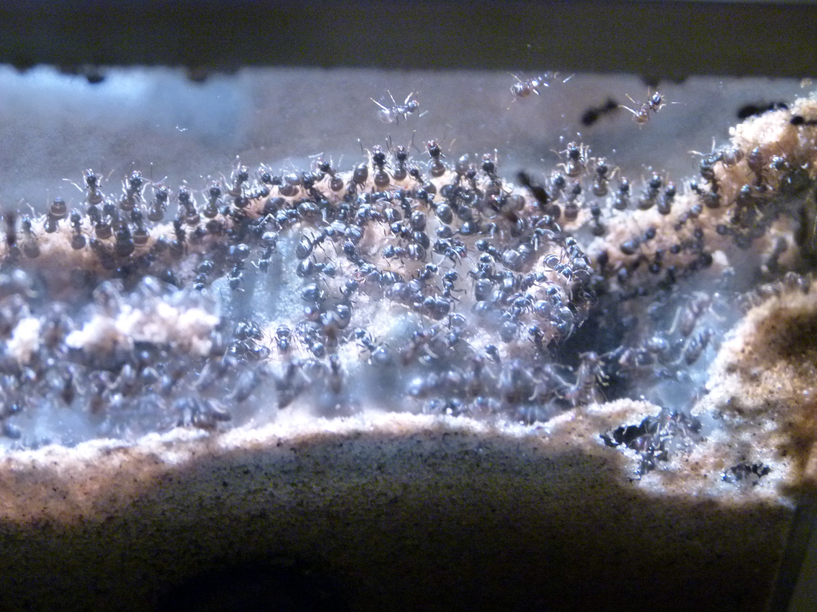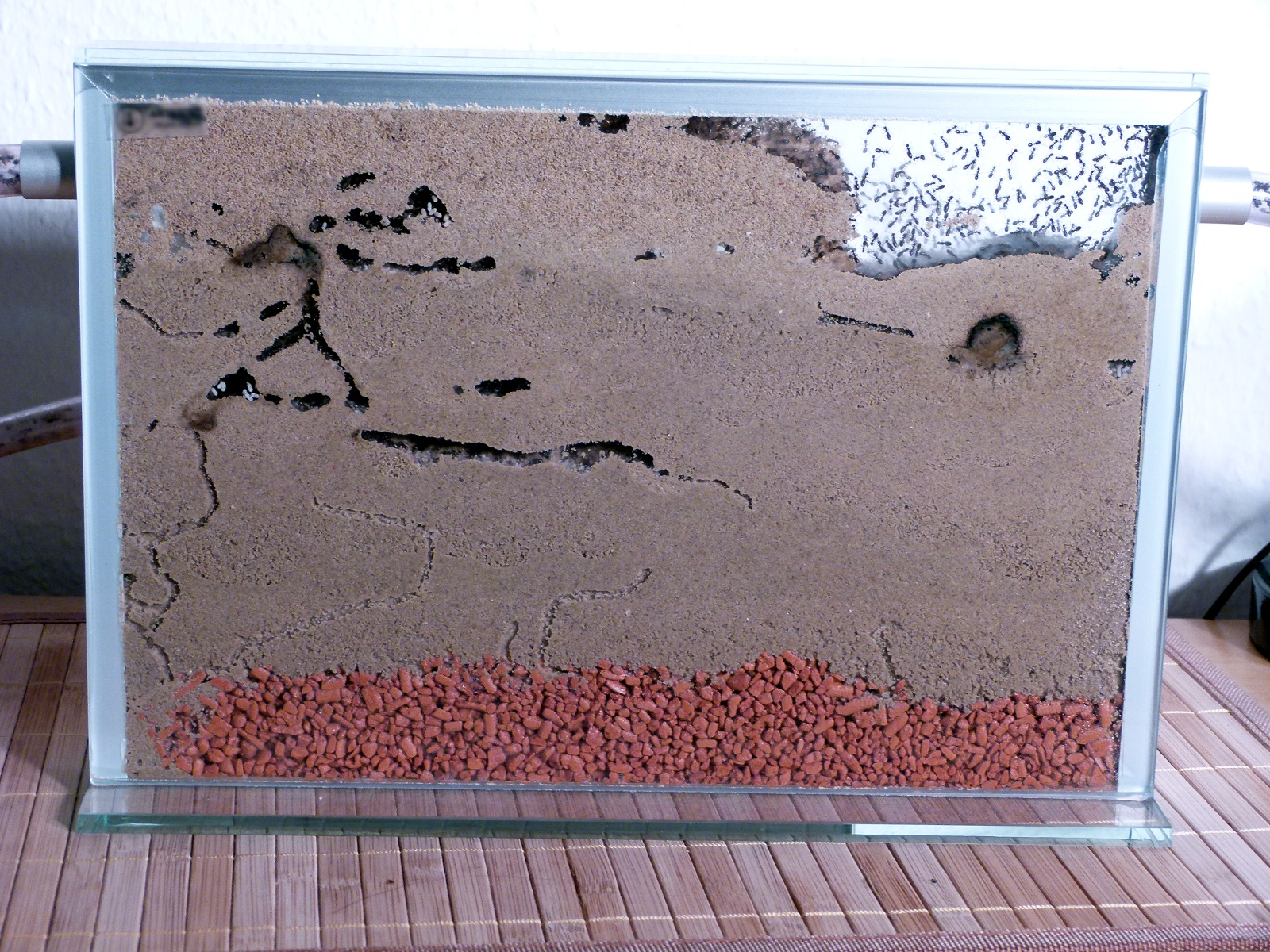 UrsprĂŒnglich war die Farm nur bis ungefĂ€hr auf die Höhe des schwarzen Flecks auf der rechten Seite befĂŒllt. Mittlerweile haben die Ameisen fast die komplette Scheibe verdeckt. Im linken Teil haben sie sogar Zwischendenken eingezogen. Wusste bisher gar nicht, dass die sowas können.