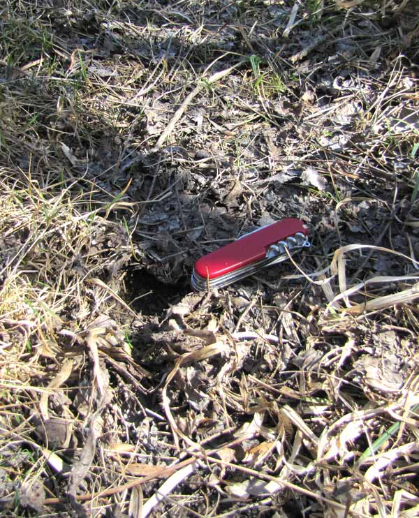 [font=Times New Roman]Sie lag direkt unterhalb /im Bild vor/ einer kleinen Vertiefung im Boden, von der anscheinend eine dĂĽnne Deckschicht aus dĂĽrrem Gras etc. abgeschoben worden war (Bild 4, vor dem linken Ende des Taschenmessers).[/font]