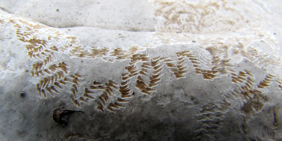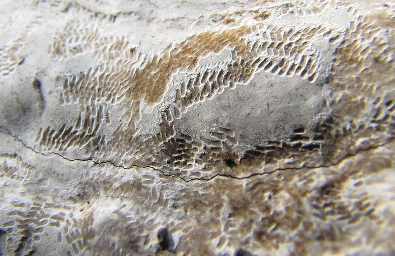 [font=Times New Roman]Vor wenigen Tagen dann sah ich die Spuren auf der fast weißen Oberfläche des Pilzes. Im Streiflicht der Morgensonne wirken sie enorm plastisch, wie mit einem feinen Meißel heraus gearbeitet. Ich stelle hier auch die ersten beiden „Rätselbilder“ nochmals mit ein, und zwei weitere (Bilder 3-6).[/font]