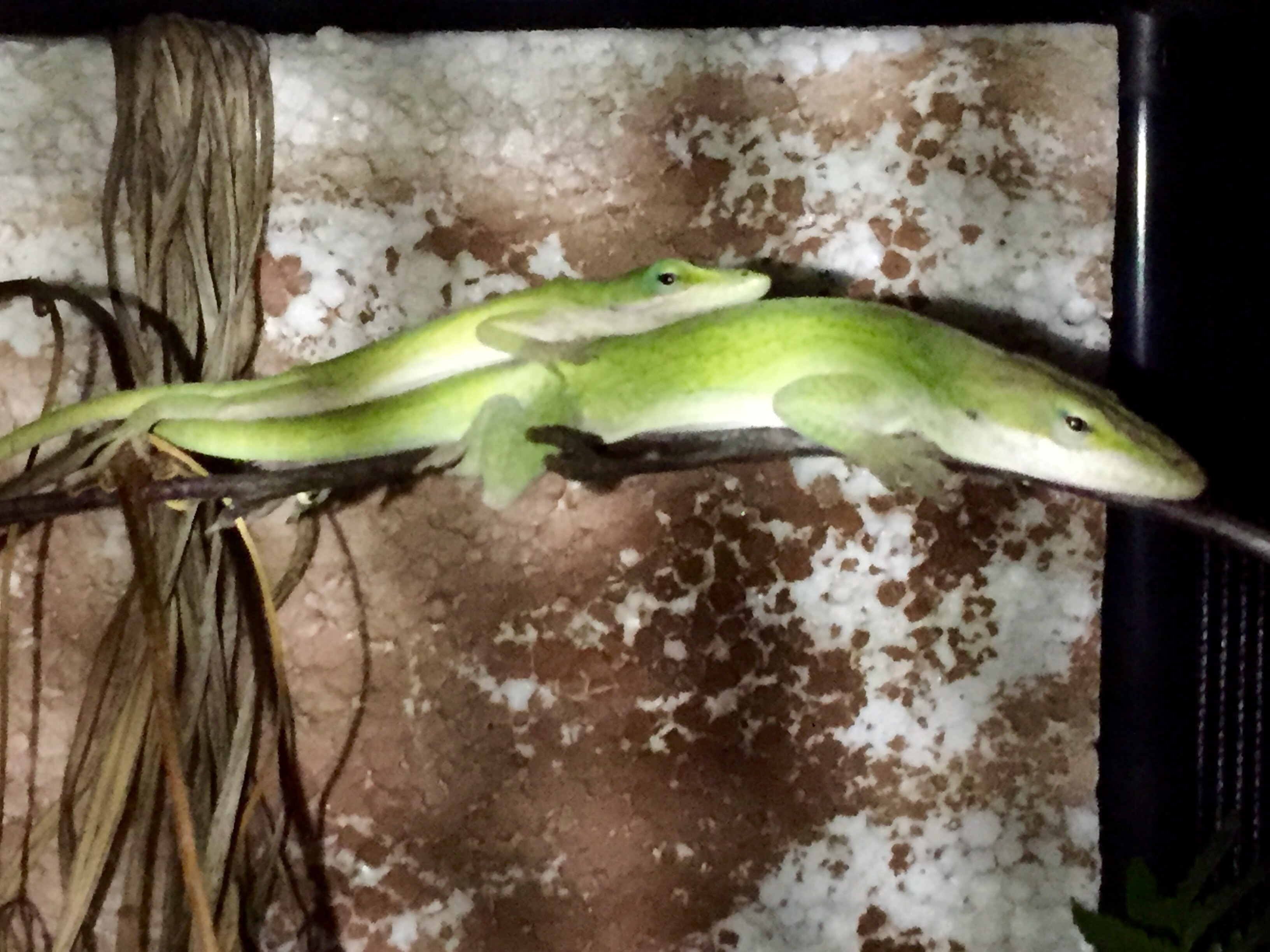 Anolis carolinensis Pärchen nachts im Freiluftterrarium auf der Terrasse