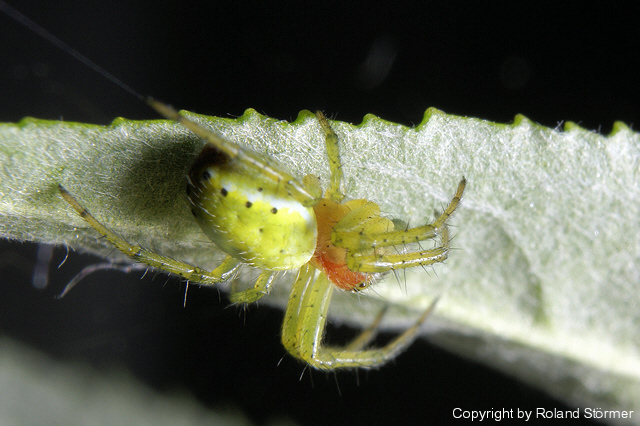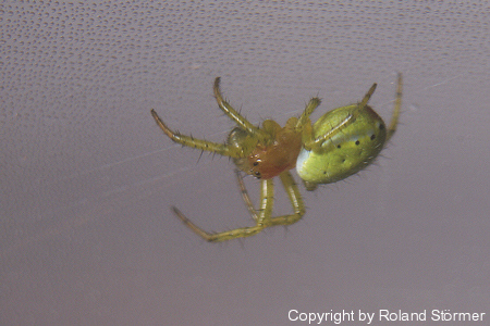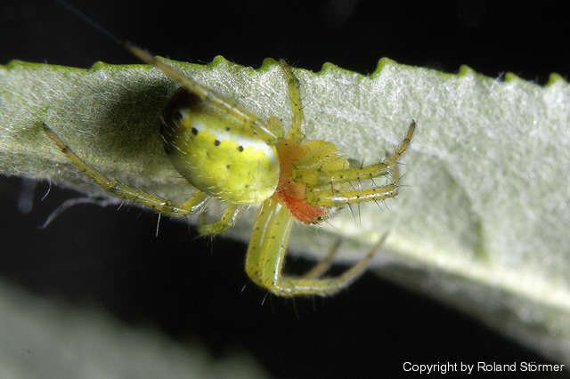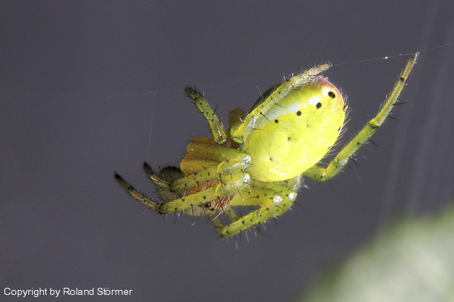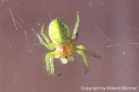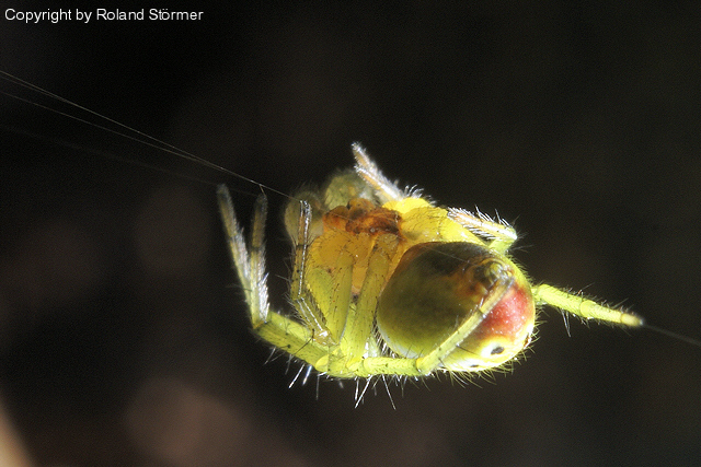 Ăbrigens: So Ă€hnlich sehen auch Kreuzspinnenarten(nicht alle) kurz nach der Geburt aus, der Körper ist noch nciht dunkel, das wird erst mit der Zeit, aber in diesem Fall ist das n Prachtexemplar von KĂŒrbisspinne^^!:-)