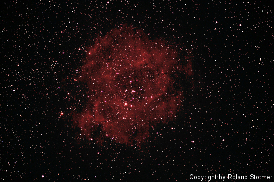 Der Rosettennebel NGC 2237 ist ein groĂer diffuser Emissionsnebel mit dem offenen Sternhaufen im Sternbild Einhorn. Es wurden 60 Aufnahmen zu je 20 Sekunden bei ISO 1600 mit der Canon EOS 1000Da am ZenithStar II Doublet APO (mit William Optics Flattener fĂŒr Refraktoren - 0,8x - 2" - Typ II) gemacht, und mit Fitswork addiert. Datum: 14.02.2009 gegen 20.00Uhr