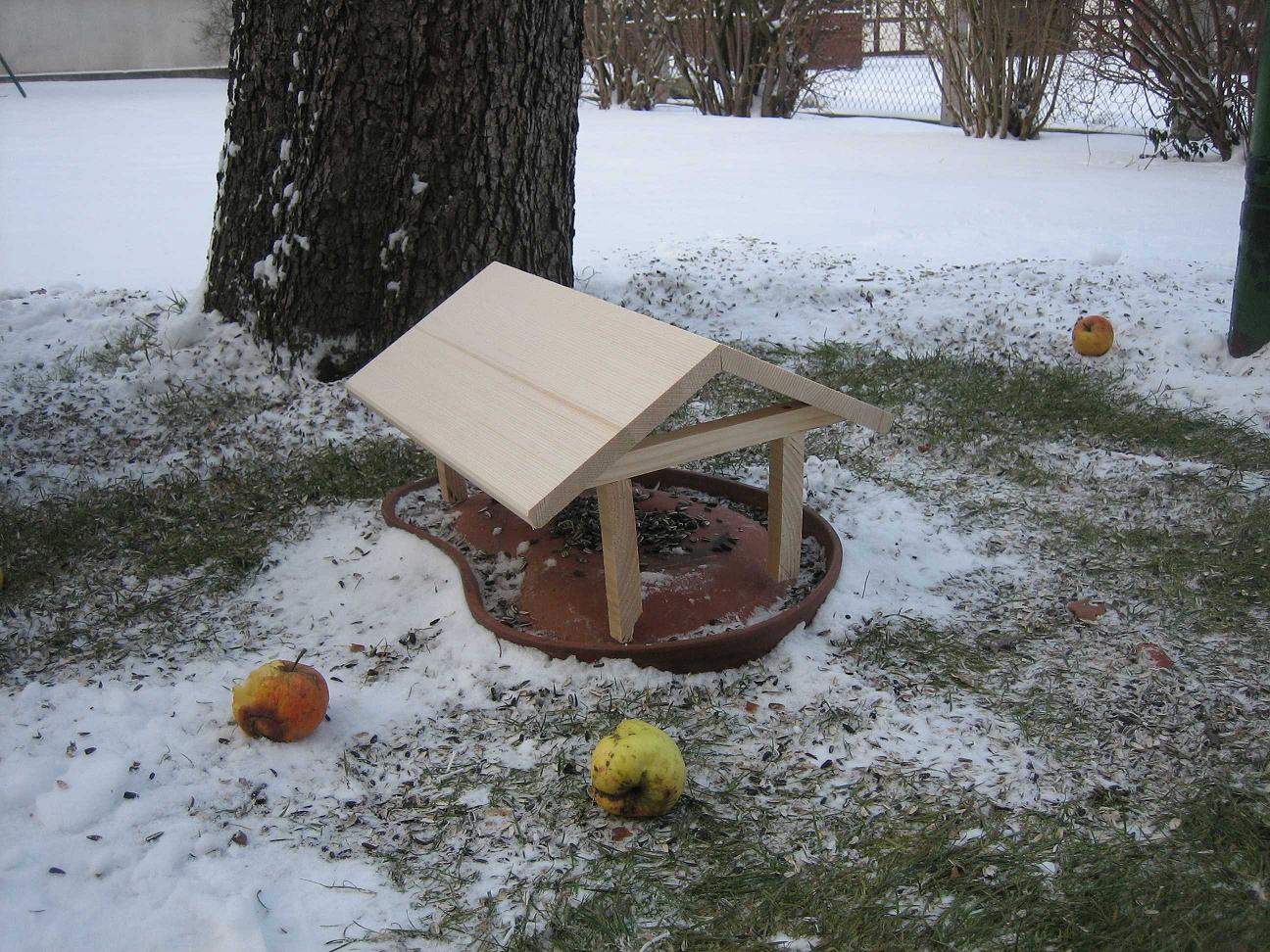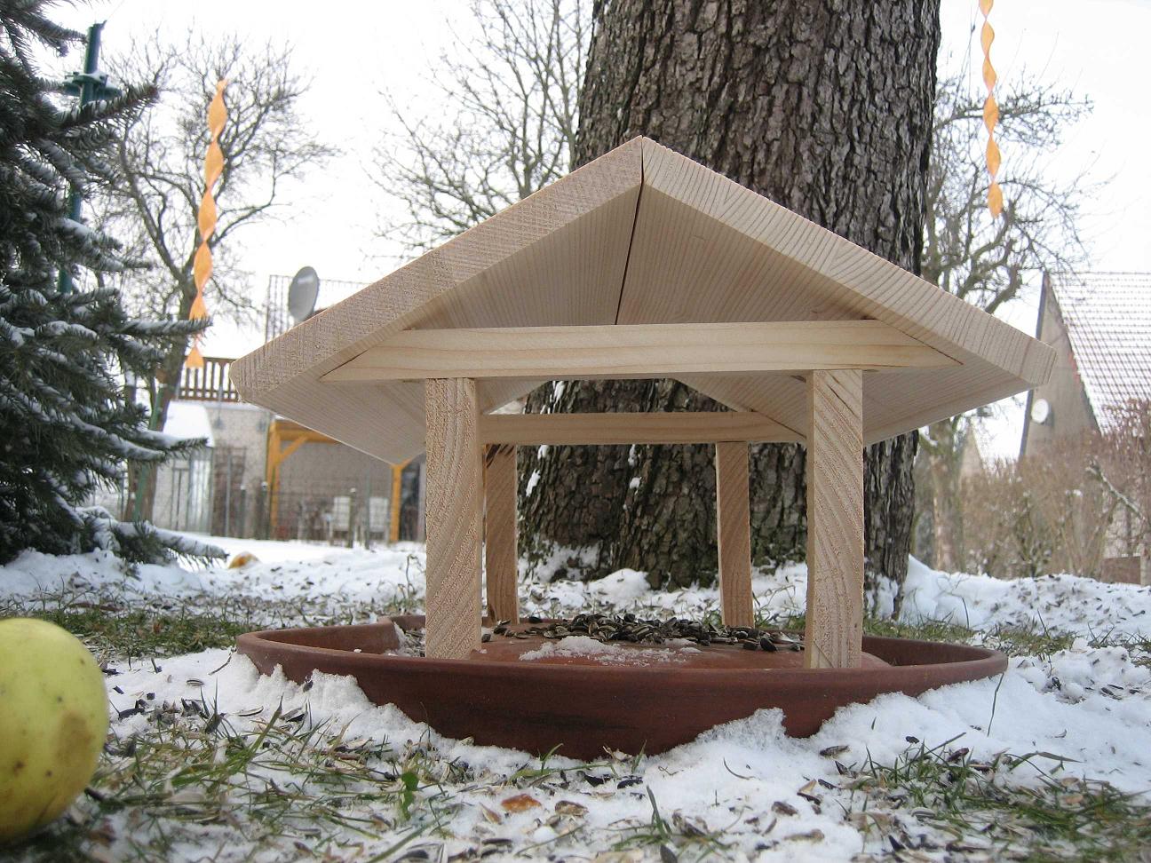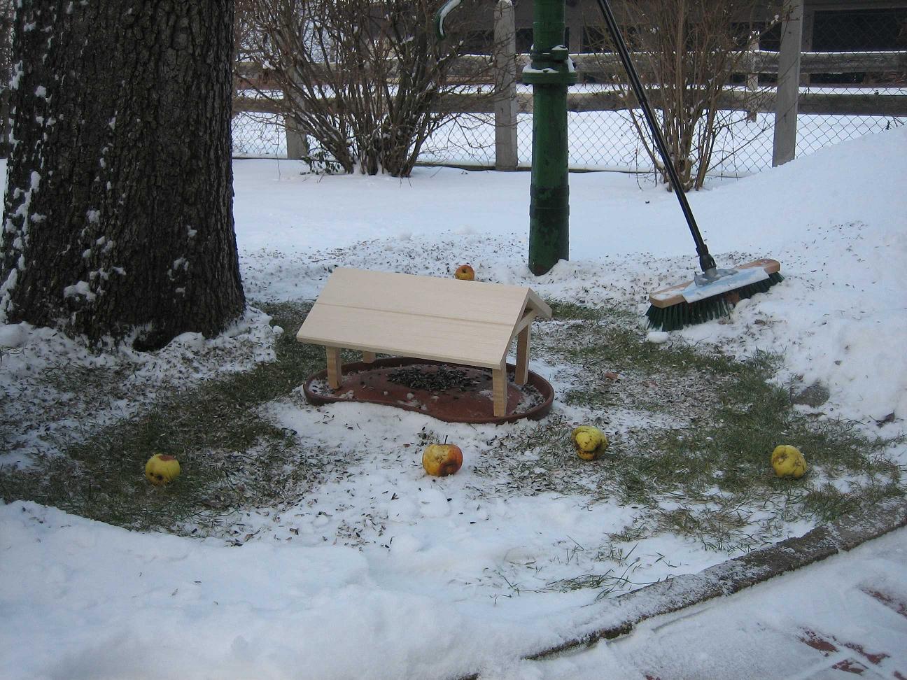 Also bin ich nach dem stĂŒndlichen SchneeschĂŒppen bei -5°C in die Werkstatt und habe in 1,5 Stunden einen Schneeschutz zusammen gewerkelt. Der erste Grundstein fĂŒr die Vogelstadt ist damit gelegt