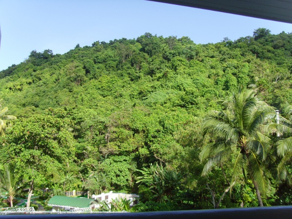 Rechts geht es in 7 Minuten FuĂweg zum Beach, die restlichen drei Seiten sind von bedschungelten Bergen umgeben.