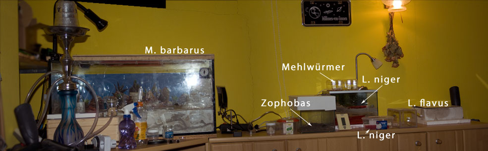 Naja, hier wird jedem bewusst sein, das die meisten Halter hier, mehrere Arten halten. Demzufolge müssen da einige Arenen und Nester vorhanden sein. Ich folgere daraus, dass viele Halter bestimmt einen Raum haben, in dem alle oder die meisten Anlagen stehen. Das ist wahrscheinlich praktischer, denn so muss man nicht durch die ganze Wohnung rennen, um siene Tiere zu füttern und zu pflegen