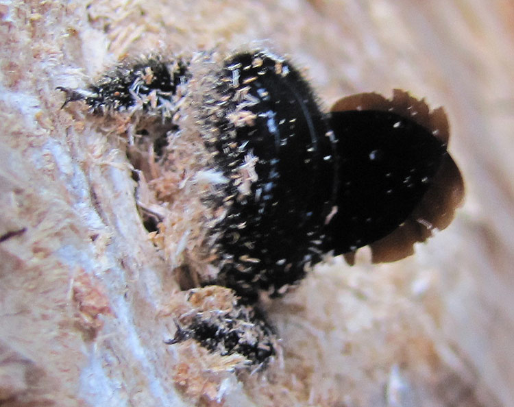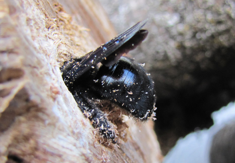 In den vergangenen Wochen mit sehr warmen Tagen waren bis zu sieben gleichzeitig vor meiner "Bienen-Favela" zu sehen. Jedes Weibchen scheint mehrere Röhren zu nagen. Sie sind unglaublich fleißig. Das ausgeworfene Holzmehl fege ich gelegentlich weg: Es waren bereits zwei Kehrichtschaufeln voll!