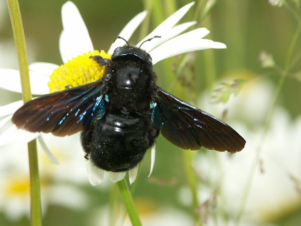 Aber ich habe auch Bilder, wo diese Bienen in voller Schönheit brillieren. Angehängt ist eines aus 2005, Xylocopa auf einer Margueritenblüte.