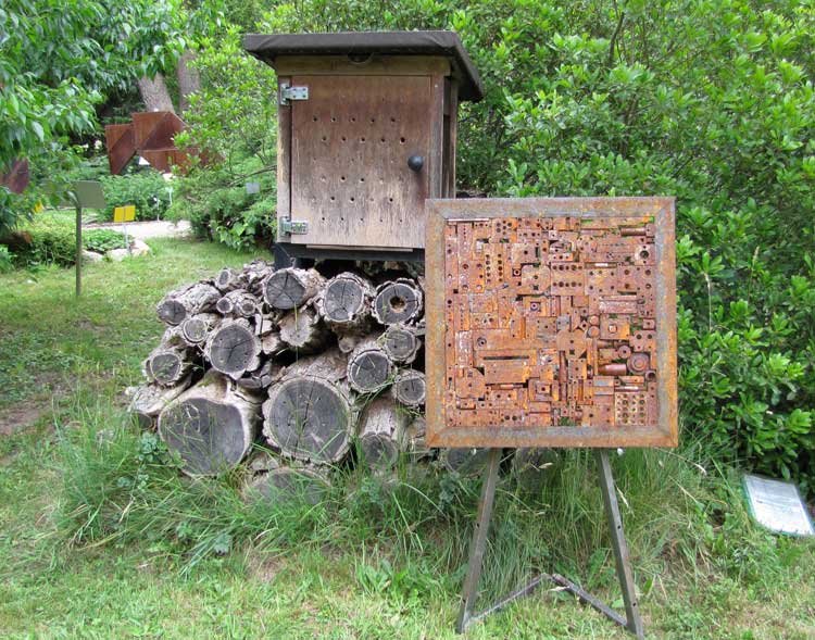 [font=Times New Roman]Bild 3: Im Hintergrund sieht man ein „Insektenhotel“, das immer da im Garten steht. Davor hat man eine Installation aus metallenen Objekten aufgestellt. Aus der Entfernung fragt man sich zuerst mal „who’s who? :)[/font]
