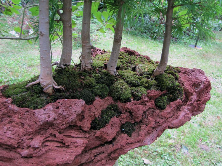 [font=Times New Roman]Da standen mehrere solche Felsbrocken mit sorgfältig gestalteten Mini-Wäldchen, auf Podesten, ähnlich wie Bistro-Tischchen. Der Künstler gab gerne Auskunft: Er hat die Objekte im Freien, im Halbschatten stehen. Sie müssen bei trockenem Wetter täglich gegossen werden, außer bei Frost (die Pflanzen sind winterhart). Natürlich ist es notwendig, die Bäumchen immer wieder vorsichtig zu stutzen, wie das halt bei Bonsais so üblich ist. Das besagt aber auch, dass die Pflege ziemlich viel Arbeit und Ausdauer und Zuverlässigkeit (täglich!) erfordert. So blieb die Brieftasche doch lieber stecken :)[/font]