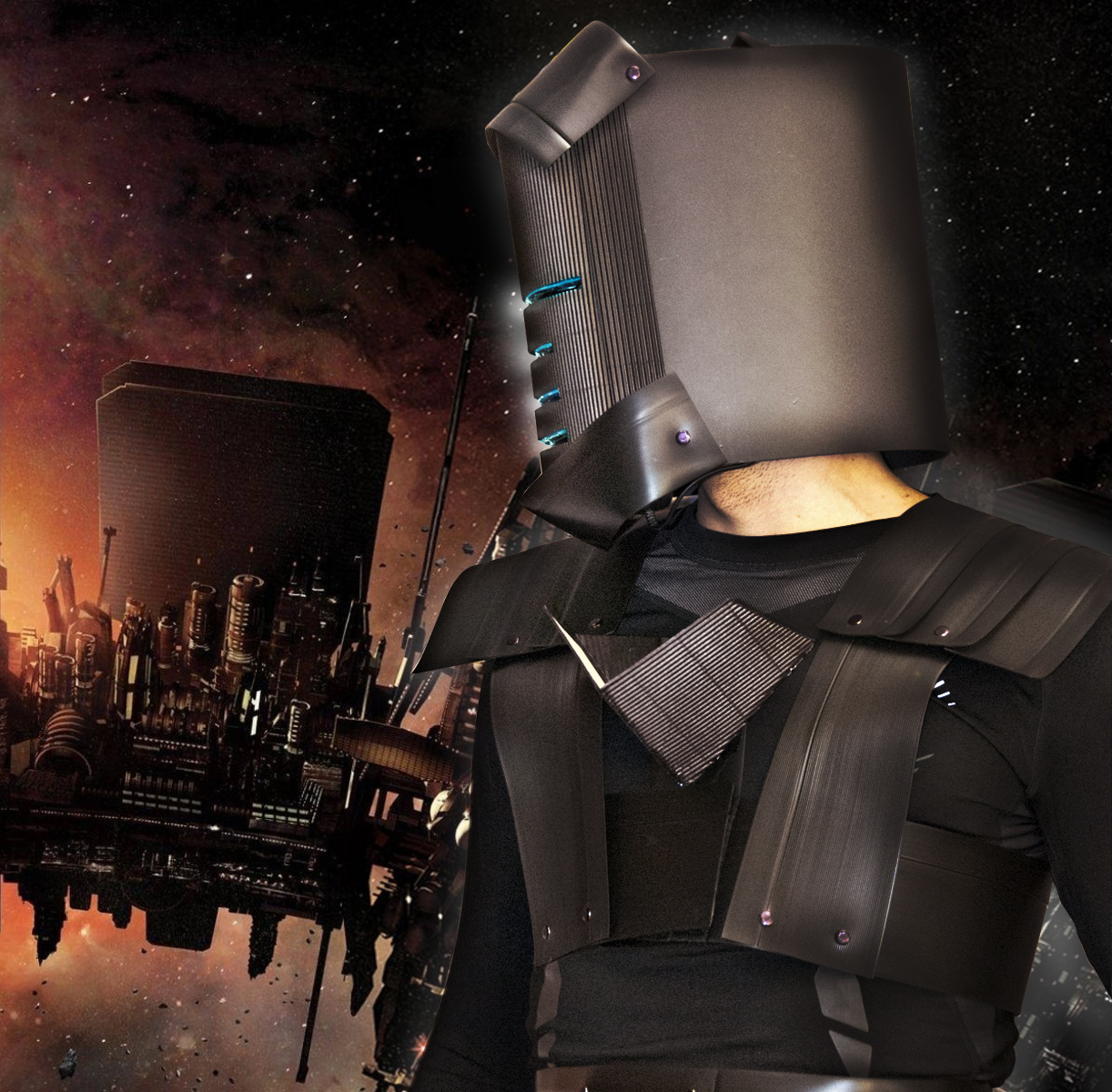 Den Helm hatte ich innen auch wieder ordentlich verkleidet und auch der Einschaltknopf fĂŒr die Lichter war fĂŒr den Helm innen verlegt sowie fĂŒr den RĂŒcken an der Frontseite angebracht. Die Ableseeinheit unter dem Helm vorne leuchtete auch innen dank fluoreszierendem Klebeband.