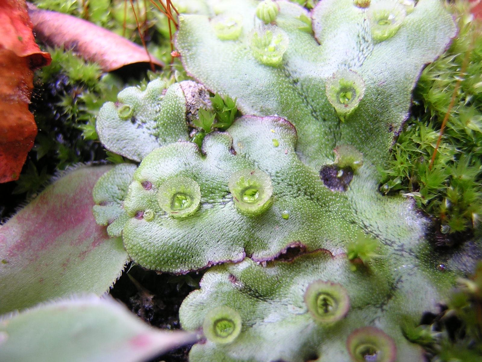 das ist, so wie ich das sehe, Lebermoos (Klasse Marchantiopsida), am ehesten Brunnenlebermoos. Die kleinen Becher sind Brutbecher, die dem Lebermoos eine vegetative Fortpflanzung ermöglichen. Eine genauere Bestimmung traue ich mir aber nicht zu....