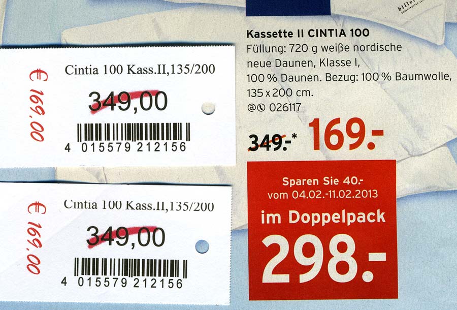 [font=Times New Roman]Da steht ĂŒber dem Barcode ein Mondpreis drauf, 349,- €, dick rot durchgestrichen. Links ist in Rot eingedruckt € 169,00. Der Gesamtpreis im Doppelpack war dann € 298,-[/font]