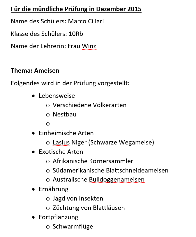 Ich bin gerade dabei das Deckblatt zu erstellen. Ich will mich dabei auf die Einheimischen Arten (Lasius niger, dann könnte ich meine Kolonie mitnehmen was Pluspunkte bringen würde) spezialisieren. Also wie sie leben, wie das Nest gebaut ist, die Kastenform (Messor/Camponuts haben ja Minor/Medium/