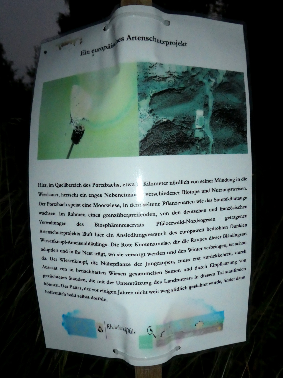 Hier im Pfälzer Wald wird seit ein paar Jahren wirklich alles gemäht, was sich mähen lässt und der Rest wird als Baufläche genutzt. Der Besitzer einer Wiese in der Nähe verwendet sogar irgendwelche Pflanzenvernichtungsmittel und ein anderer hat wiederholt die Vegetation am Bach, welcher durch seine Wiese fließt, mit einem Gasbrenner niedergebrannt. Wilde, unberührte Wiesen findet man so gut wie gar nicht mehr und entsprechend selten sind z.B. Gottesanbeterinnen, bestimmte Grashüpfer/Heuschrecken und Falter geworden, während die Amerikanische Kiefernwanze sich vermehrt wie blöd. Umso mehr hat es mich erfreut, als ich vor Kurzem in unmittelbarer Nähe diese Plakette am Rande einer Wiese sah: