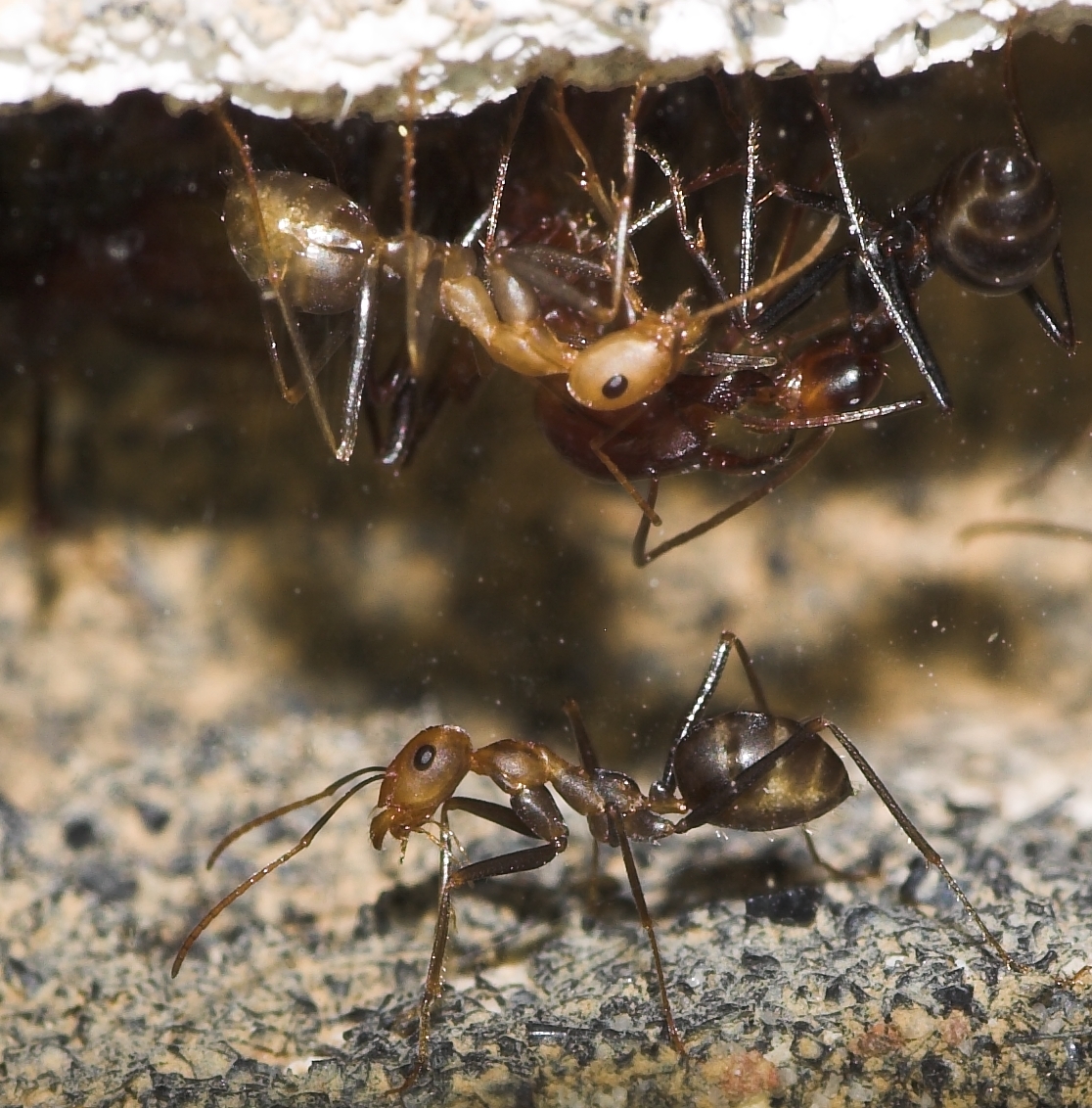 Sehr aggresive Tiere, auch untereinander. Regelmäßiges an stubsen anderer Arbeiterinnen. Transportieren sich regelmäßig ins Nest dabei auch nicht zimperlich. Können mich sehen wenn ich vor dem Becken sitze, reagieren dann auf meine Bewegungen sehr aggressiv und wollen mich attackieren! Bei der Jagd sind sie sehr vorsichtig und greifen ihr opfer immer wieder an um dann blitzschnell wieder davon ab zulassen, dann wird die Beute umgehend ins Nest gebracht!