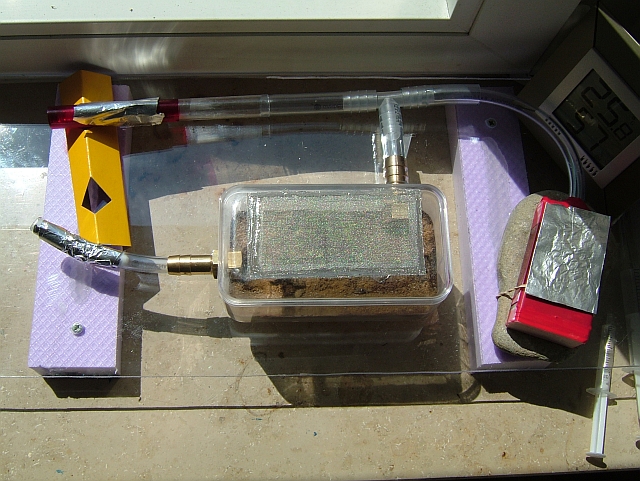 Der Ytong wird in die Schachte geschoben, an der ein Schlauch angeklebt ist, dann möchte ich den Wassertank mit Sermais auffüllen und schließlich den Deckel der mit Silikon abgedichtet ist aufkleben, zuvor natürlich noch ein Loch zum Befüllen gebohrt.