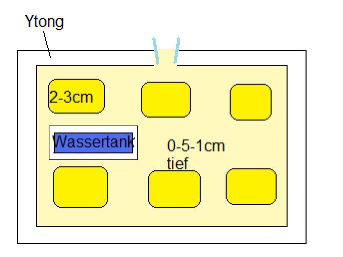 Naja, meine neue Idee ein liegendes Y-tong Nest. Dieses ist bis auf einen Rand, mit Aussparung für den Nesteingang, und einen Rand um den Wassertank, komplett, 0,5-1cm oder vll auch weniger, muss ich mal schauen, ausgehüllt. Dann gibt es noch ein paar erstmal nicht verbundene Kammern.