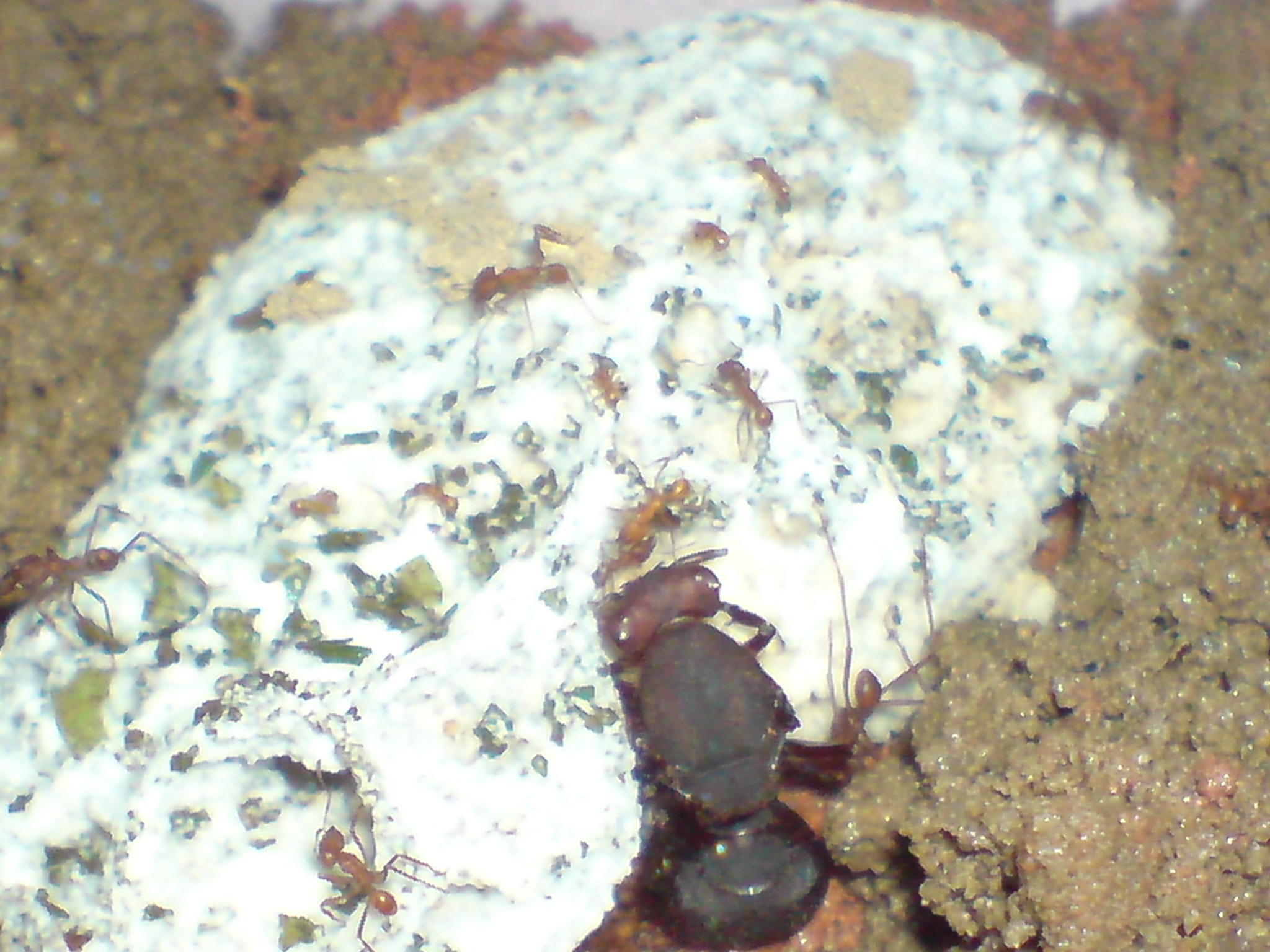 Es hat sich noch nicht so viel bei ihnen getan, da es an Aussenarbeiter mangelt. Ich kann aber beobachten, das der Pilz schon um einiges abgesagt ist. sie graben den Sand und das Seramies, unter dem Pilz nach oben. Also man merkt das sie den Pilz mit Sand umbauen wollen. Es haben sich im Sand rund um den Pilz, viele kleine Gänge gebildet, Die bis unter den Pilz führen. und rund um den Pilz hat sich schon ein guter Wall ergeben. Ich konnte beobachten, das im Pilz viele Eier, Larven und schon sehr viele größere Arbeiterpuppen sind. Es wird also nicht lange dauern, und da habe ich viele neue Arbeiter.