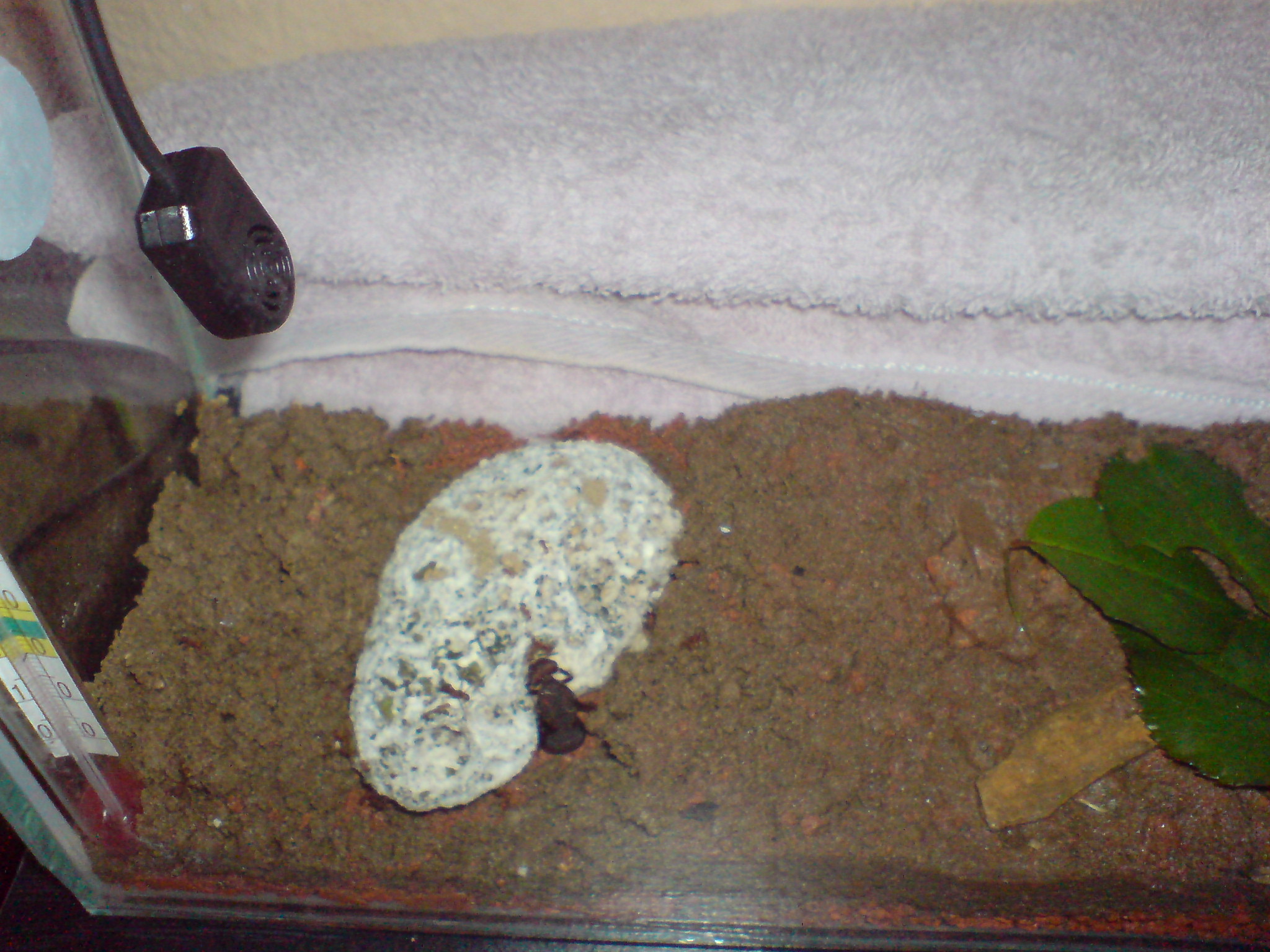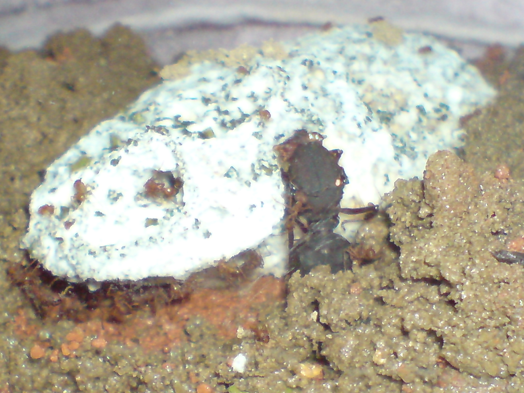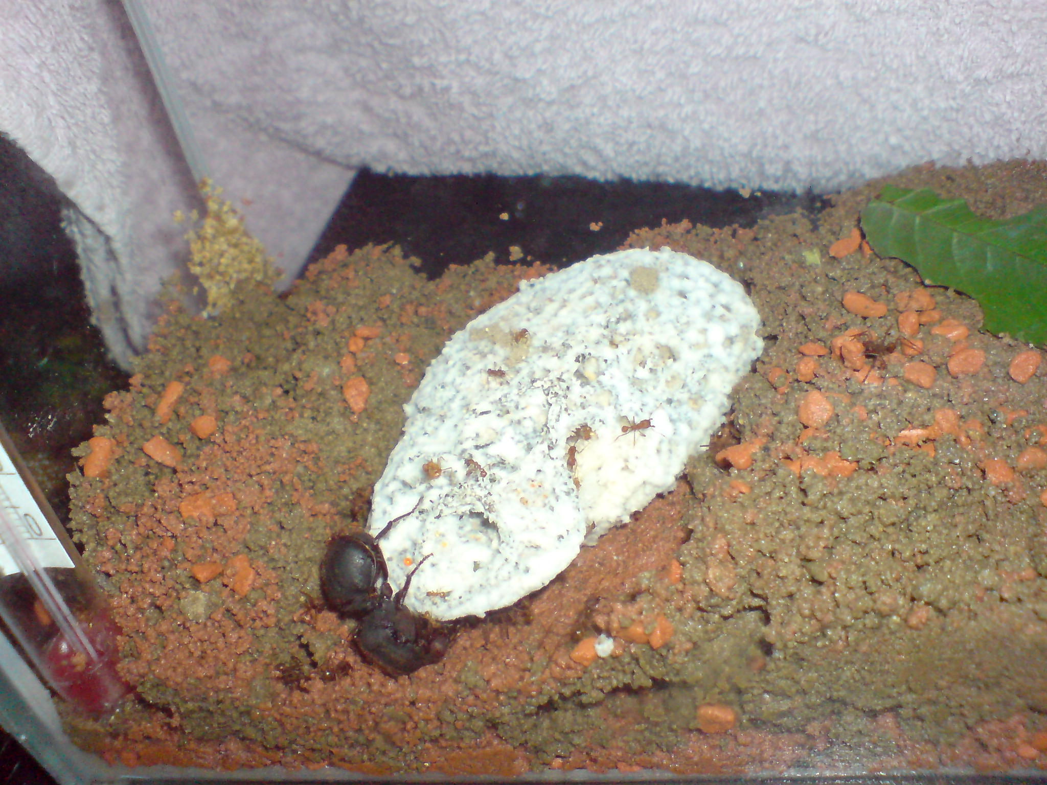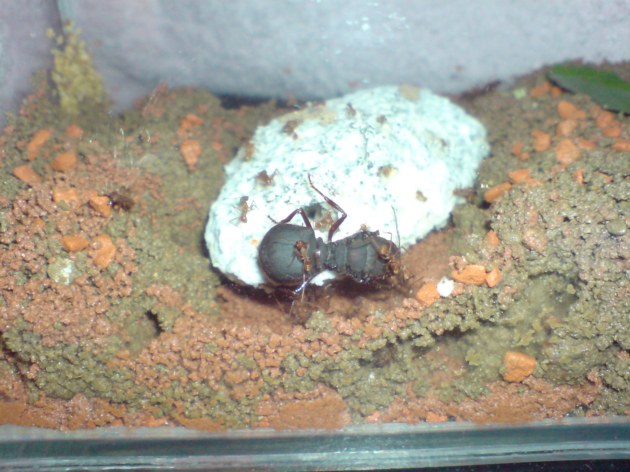 Ich habe die extrem schöne-Große Gyne und ca. 40 Arbeiter wo schon die ersten großen media Arbeiter schon zu sehen sind. zur Brut kann ich nichts sagen da sie sich im Pilz befindet. Konnte nur vorhin beobachten wie eine etwas größere Arbeiterin ein riesen Eipacket in den Pilz schleppte. Der Pilz hat schon fast die Größe eines Tennisballs der Platt gedrückt wurde. Aber näheres könnt ihr morgen auf den Fotos sehen, da sieht man noch die gesammte Kolonie. Leider erst morgen weil ich meinen adapter für die Cam erst von meinen Eltern holen muss. Sonst bekomme ich die Bilder nicht auf den Rechner.Aber geschossen sind sie schon!
