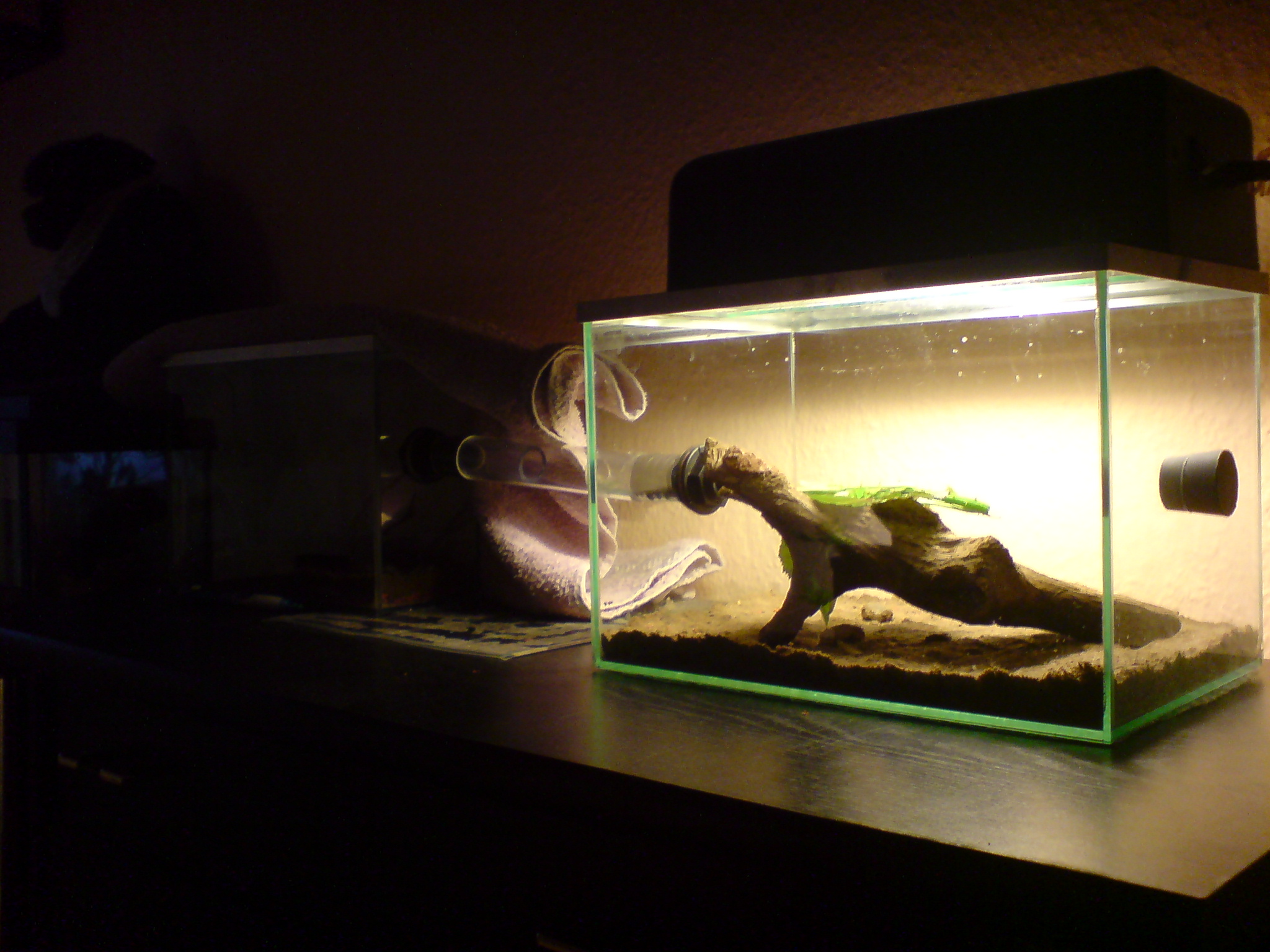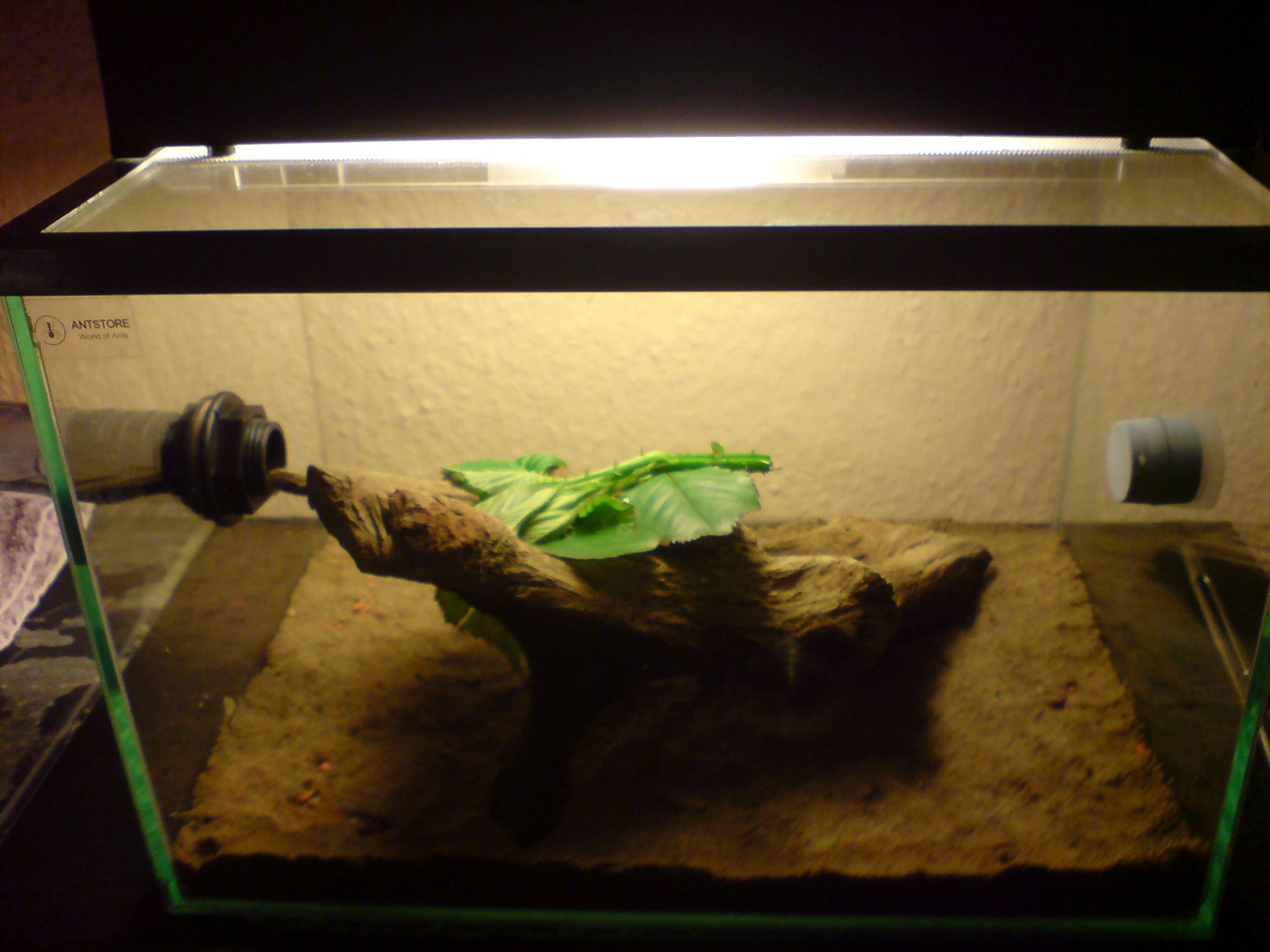 Ich habe die Kolonie samt 30x20 cm Becken übernommen. Das Becken war ca. 4cm hoch mit erde gefüllt, und in der Mitte des Beckens war ein riesen Hügel zu sehen, welchen die ameisen ausgehoben haben. Unter diesem Hügel befand sich die Kolonie samt Pilz. Wir steigten also wieder in unser Auto und machten uns auf den Weg nach Hause. Dort angekommen stand meine Atta Anlage. Sie besteht aus einem 30x10x20 cm Becken(Pilzbecken) welches ich mit ca. 1 cm Seramis gefüllt habe, und einem Sand-Lehm Gemisch da drüber von ca. 2 cm. Ich habe in dieses Becken ein Luftfeuchtigkeits Messer welcher sich über ein Fühler(Sensor) die Luftfeuchte misst und sie ans Ausengerät weiterleitet. Dann habe ich über die Schlauchverbinder ein 30x20x20cm Becken(Futterbecken) verbunden. Auch in diesem Becken befindet sich 1cm Seramis und darüber ca. 2cm Sand-Lehm Gemisch. Es ist eine Wurzel in diesem Becken welche an den Schlauchverbinder fürt und als Treppe dient.