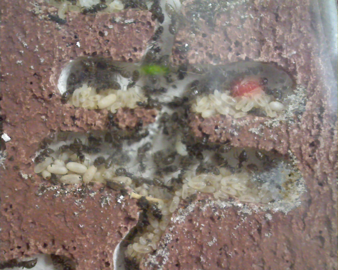 Naja. Als ich alle hatte legte ich das RG in die Arena und liess sie wieder nach Hause. Z.Z. habe ich aber ein großes Problem. Nach circa einer Woche des Umzuges stellte die Kolonie ihre Aktivität auf ein absolutes Minimum. Honig und Fliegen werden zwar genommen, aber nur von vereinzelten Arbeiterinnen ins Nest gebracht. Die