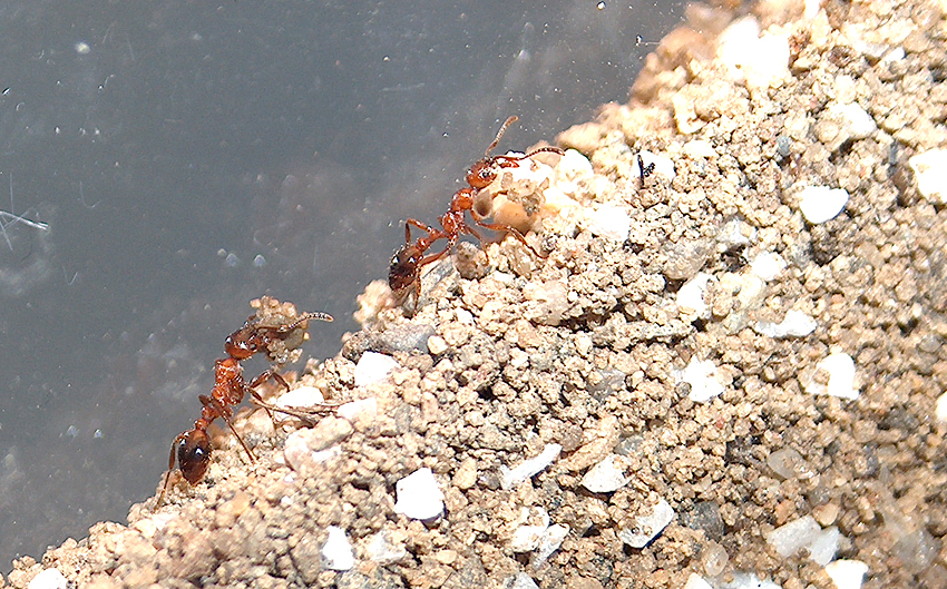 06.04. Seit 2 Tagen gräbt sich die kleinste unter den Manica kurz Oberhalb von der ehemaligen ersten Brutkammer wo auch die Myrmica drin waren (und von dort verschwunden sind) einen Gang hinunter der wohl bis wohl zur jetzigen unteren Brutkammer führen soll - während die anderen bei der Königin bleiben. Komisch das immer nur die kleinsten am meisten arbeiten. Oben hat sie schon einen über ein Zentimeter hohen Hügel aus verklebten Sand aufgeschüttet.