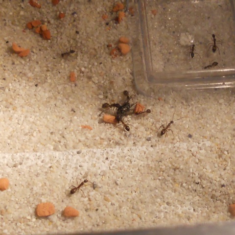 Die Kolonie wÀchst gut, sie fressen jeden Tag 1-2 Heimchen oder Mehlwurm. Das Zuckerwasser decken sie immer mit Steinchen zu. 8 Arbeiterinnen und