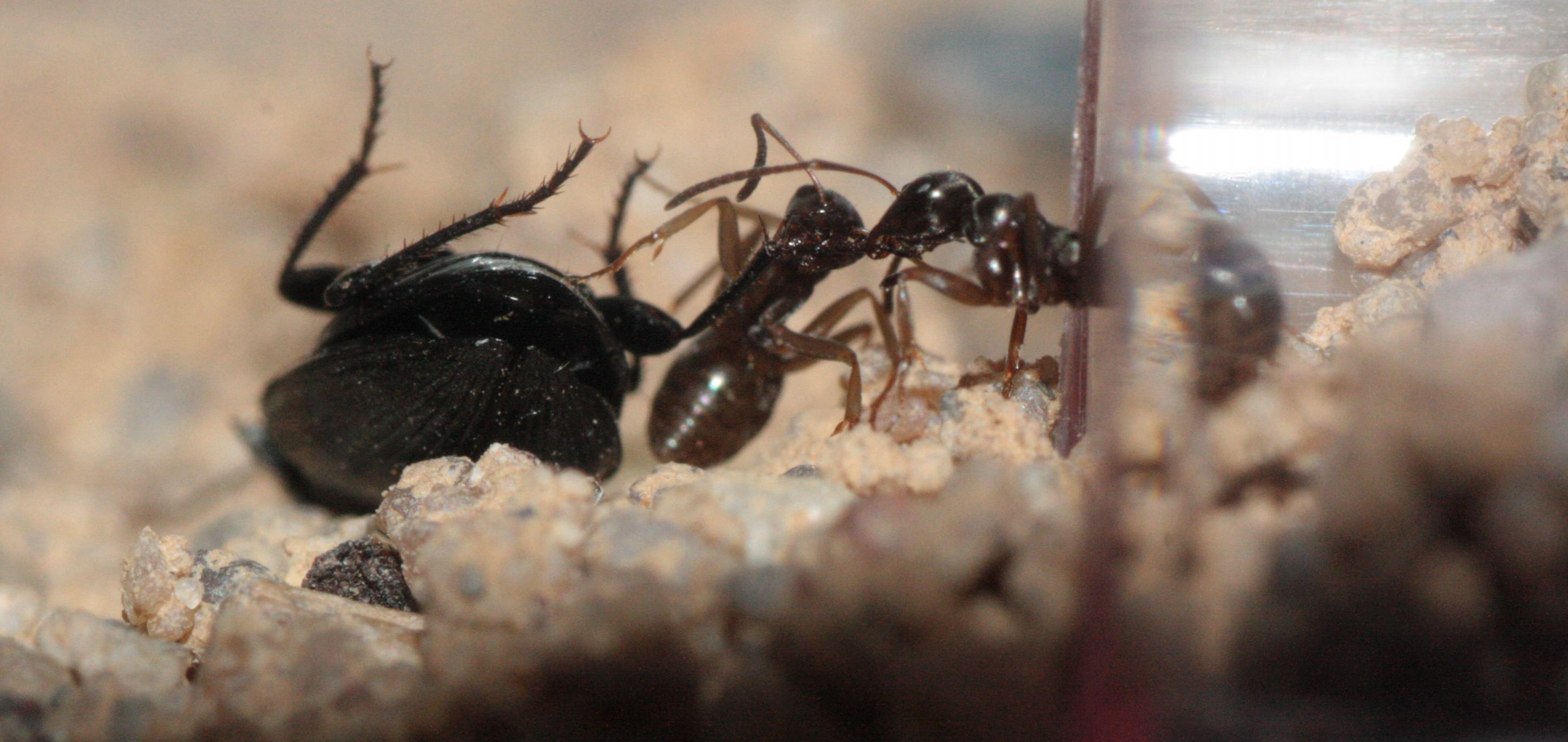 Es wird viel furagiert und es kommt immer häufiger vor das mehr als 2 Arbeiterinnen gleichzeitig furagieren. Vor einigen Tagen waren sogar 10 Arbeiterinnen draußen und haben an zwei Käfern rumgezogen. (Siehe Bilder)
