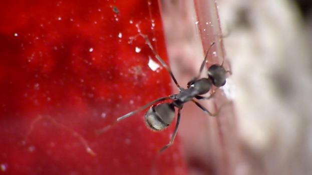 Fazit zur Überwinterung Die Styroporbox war, im nachinein betrachtet, zu klein. Nicht für die Ameisen direkt, aber es hätte bei weitem mehr "Ausgleichsmasse" in die Box eingelagert werden müssen, um starke Temperaturschwankungen und damit Kondenswasser, Ein- und Zufrieren des Wassertanks zu vermeiden. Auch mit der stark steigende Luftfeuchtigkeit in der Box in den Phasen ohne Öffnung der selben war ich nicht sonderlich zufrieden. Zum nächsten Winter werde ich ziemlich sicher mal den Keller als Überwinterungsort ausprobieren! Frühjahrsputz Bis jetzt hat sich offensichtlich noch nicht viel getan. Allerdings haben sie schon ziemlich viel Material herumgeschleppt und das Nest in Schuss gebracht. Dazu gehörte auch die Öffnung des Reagenzglases, das im Gegensatz zu den Nestern unserer Lasius cf. niger vor der Winterruhe von den Arbeiterinnen komplett verschlossen wurde. Ansonsten ist die Außenaktivität im Moment noch kaum zu verzeichnen. Ich habe trotzdem ein paar Schnappschüsse aus einem kleinen Video.
