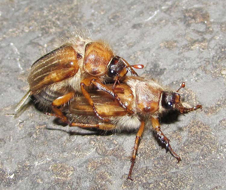 [font=Times New Roman]Bild 7: Am selben Abend saß ich beim Dämmerschoppen auf der Terrasse unter einer dort Schatten spendenden Kiefer. Es war schon fast dunkel, gegen 22:00. Erstmals in diesem Jahr flogen „Junikäfer“ (Amphimallon solstitiale) auch in meinem Garten. In der Gegend (Südhessen) sind sie nicht selten.[/font]