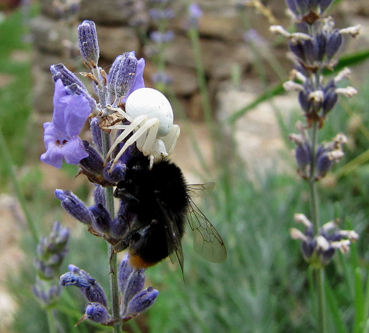 [font=Times New Roman]Bild 8: Fette Beute! Am 10. 07. hatte diese „Veränderliche Krabbenspinne“, Misumena vatia, auf einem Blütenstand des Lavendels in meinem Garten eine Steinhummel erbeutet. Eigentlich soll sich diese Spinne in der Farbe an die jeweiligen Blüten anpassen, auf oder in denen sie auf Beute wartet. Aber vielleicht ist unser Exemplar hier farbenblind?