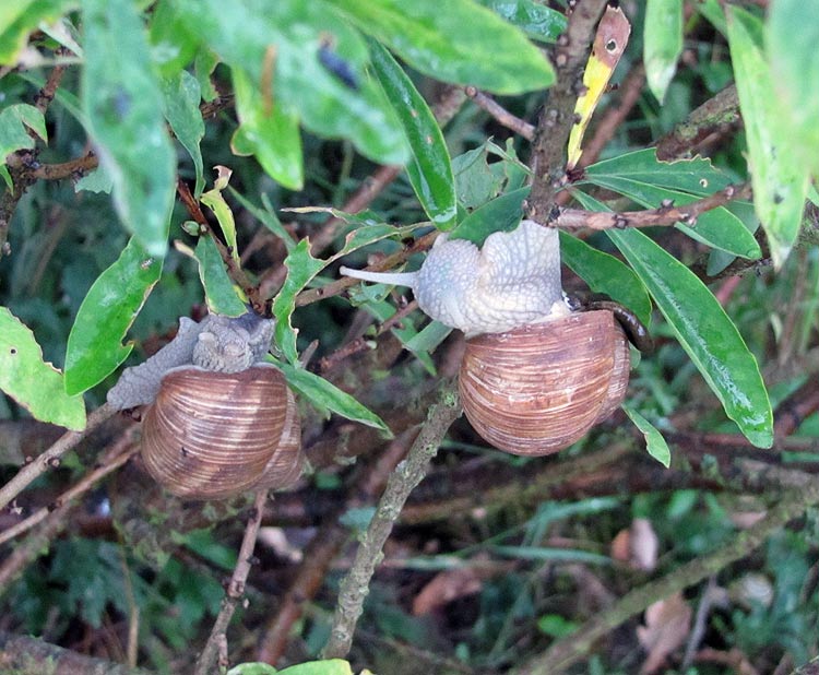 [/font][font=Times New Roman]Bild 9: Kletterkünstler, von denen man es eher weniger erwartet. Ebenfalls in meinem Garten lebt eine recht große Population von Weinbergschnecken (Helix pomatia). Sie genießen Naturschutz und vermehren sich prächtig. Die Nutzpflanzen lassen sie in Frieden. Schon öfter habe ich beobachtet, dass die Tiere um in den Seidelbast-Sträuchern (Daphne mezereum) hochklettern, bis 70 – 80 cm über dem Boden, wo sie dann die Blättchen genüsslich abweiden.[/font]