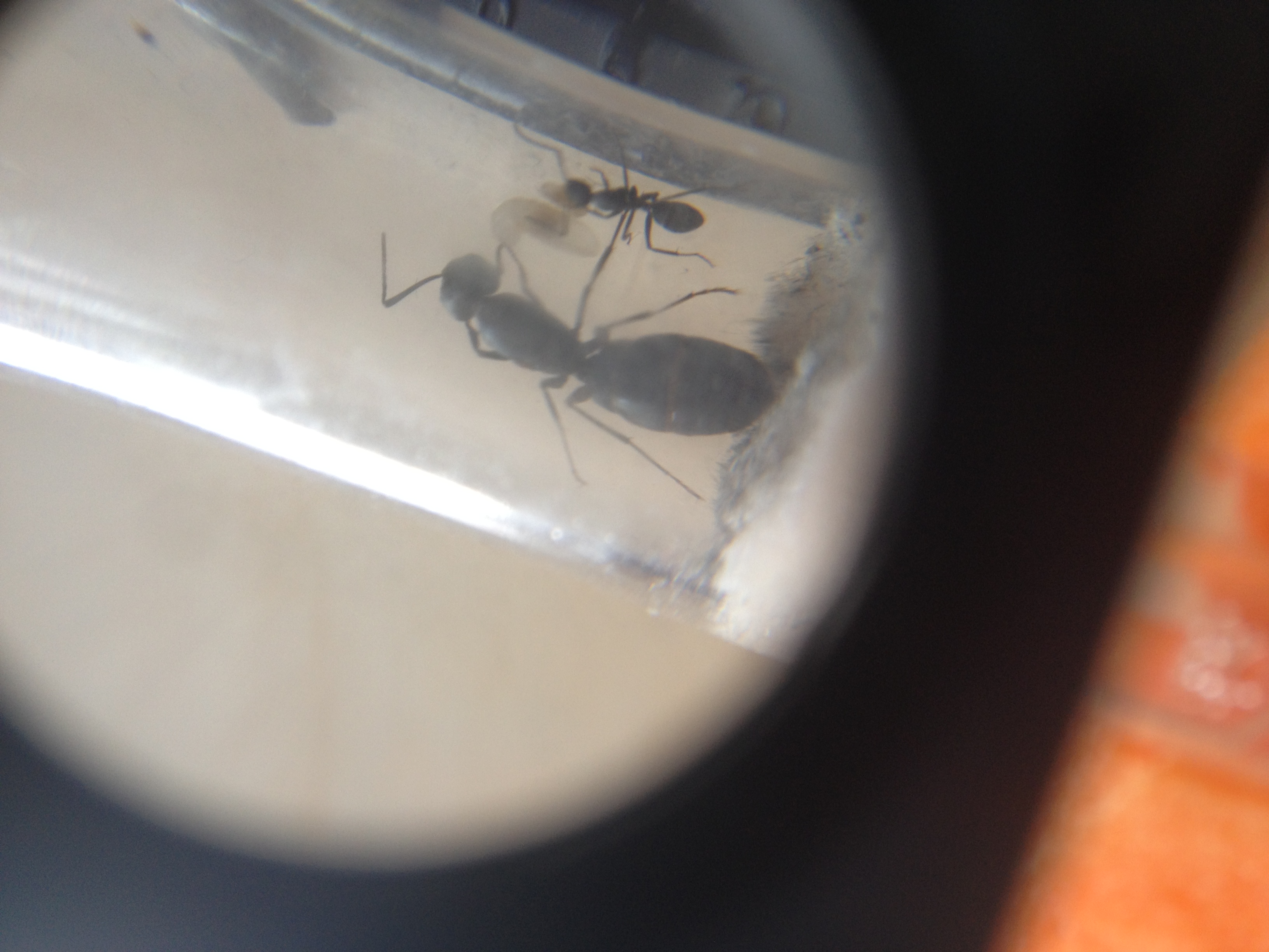 Ein paar Tage spĂ€ter hab ich dann eine der Arbeiterinnen ausserhalb des Ytong Nest gesehen. Sie hatte es durch ein Loch in der Folie am anderen des Steins verlassen wo normalerweise eine der Spritzen fĂŒr die Befeuchtung steckt. Hab sie mal laufen lassen da sie sehr aufgeregt unterwegs war. Nachdem sie aber schnell einen Weg weg vom Nest runter und weg finden wollte wird sie wahrscheinlich ihre Zeit erreicht haben und sich vom Nest entfernt haben. Hab sie zumindest nicht mehr gesehen die letzten Tage.