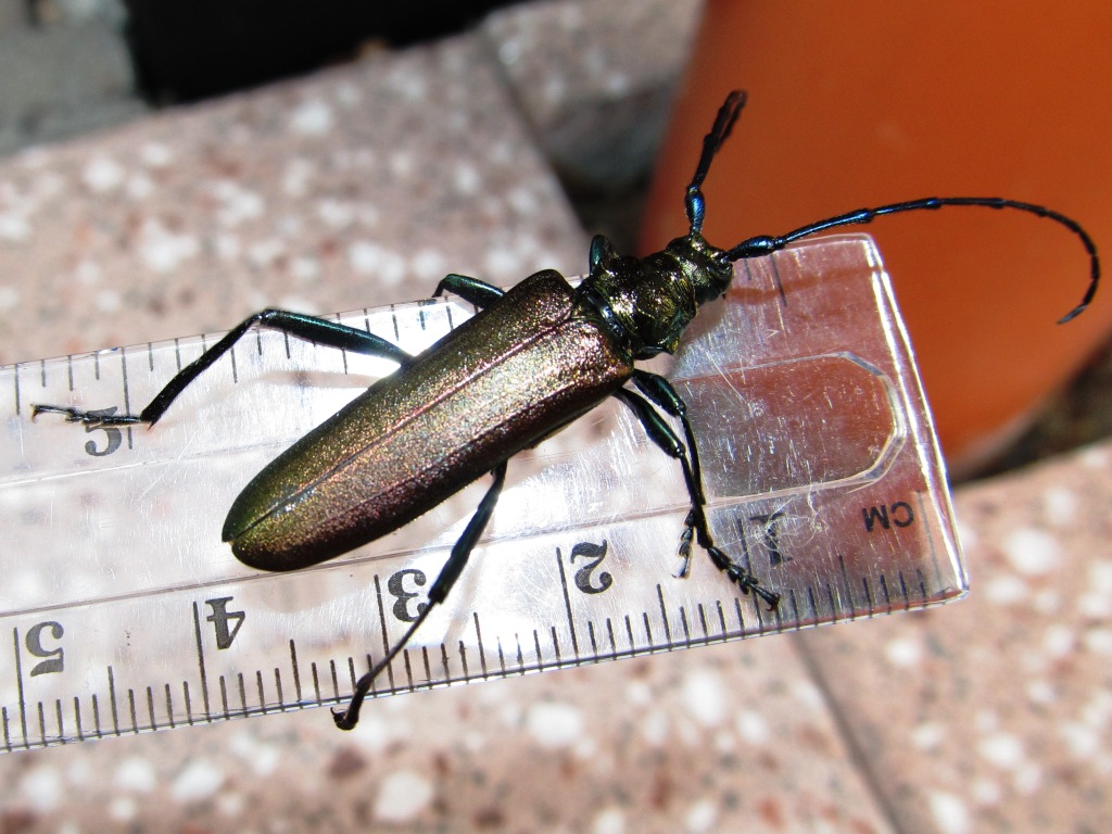 vergleiche mal mit Bildern vom Moschusbock (Aromia moschata). Wenn es sich, um diese Art handelt, könnten sich in der nähe Bestände von Weiden, Pappeln oder Erlen befinden, da sich dieLarven xylobiont, d.h. vom Holz und dort bevorzugt von Weichholz ernähren.