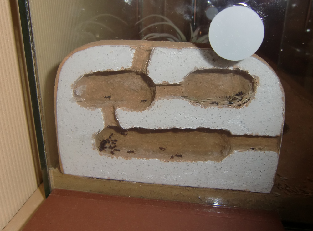 Ich habe bereits ein neues Nest mit verbessertem Kammersystem konstruiert, noch dient dieses nur der Dekoration und Arenaeinrichtung, dennoch sind häufig Arbeiterinnen darin unterwegs. Einen Umzug werde ich jedoch nicht in die Wege leiten. Interessant zu beobachten ist, wie die Kolonie jegliche Spalten zwischen Glas und Ytongblock mit kleinen Sand-Lehm Krümeln zubaut, selbst im neuen Nest selbst.