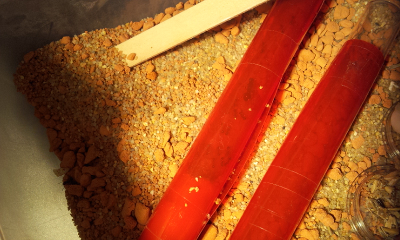 6. Und bei dem Punkt kommt es zu meinem größten Problem und Anliegen. Ich habe das Formicarium mit einer Sand/Lehmmischung etwa 3:1 befüllt (am Boden 5cm Ton-Granulat) und etwas Granult mit reingemischt, habe in einem anderen Forum gelesen, dass das besser für die Befeuchtung ist.