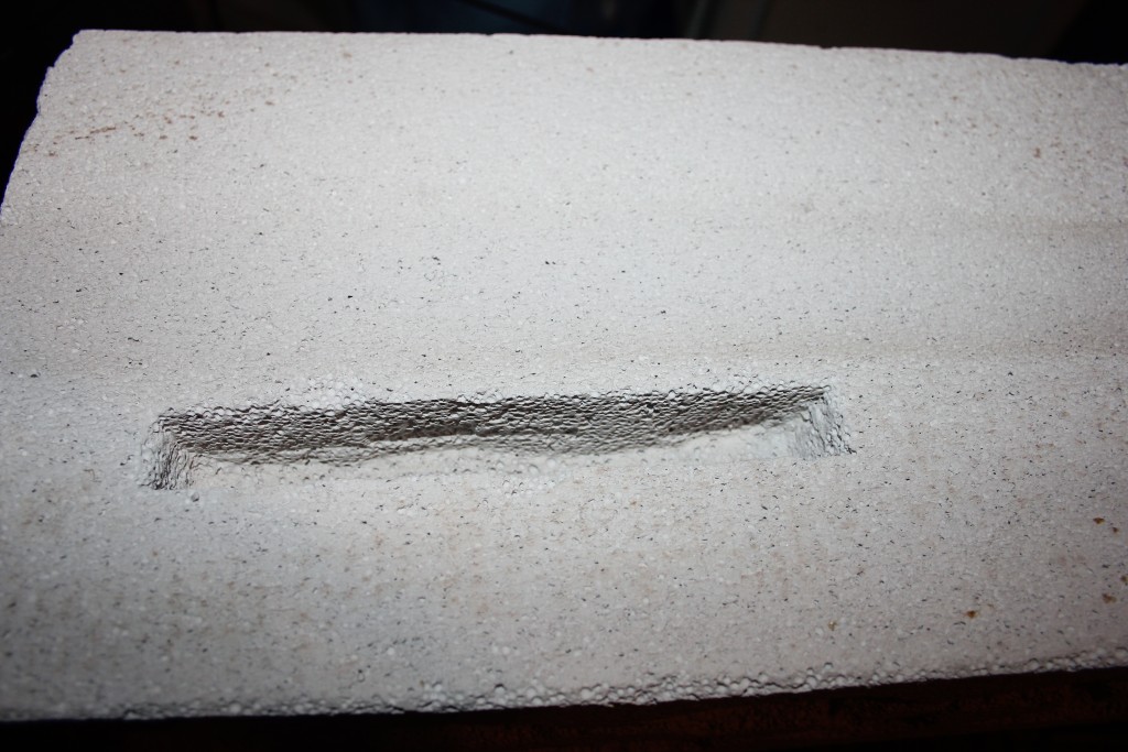 Die Maße des BewĂ€sserungsgraben habe ich mir ĂŒber die Bauanleitung ausgerechnet und ebenfalls mit Hilfe von Meterstab und Ahle angekratzt. Danach habe ich den Spachtel immer ein paar mm in die Linien reingeklopft (mit einem der Schraubendreher als sanfteren Hammerersatz) und dann einen kleinen Schlitzschraubendreher immer leicht hineingeklopft und kleine StĂŒckchen herausgebrochen. Nach 3 DurchgĂ€ngen hatte ich somit die gewĂŒnschte Tiefe Erreicht (Bild 8).