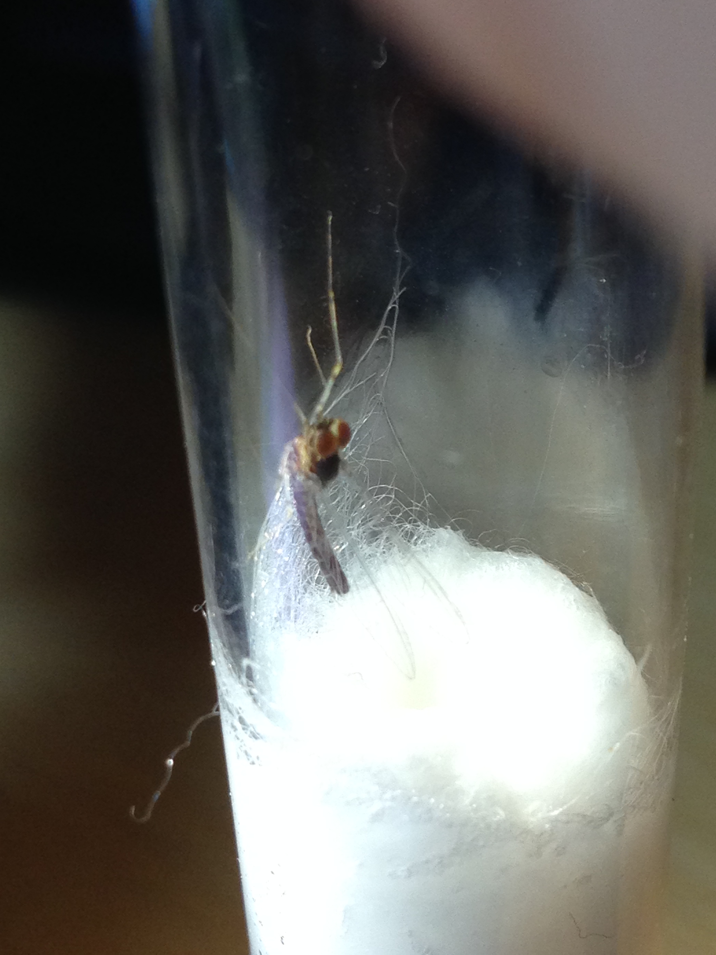 Es ist etwa 8 - 10 mm lang, grau-braun, einen nach oben gebogenen Hinterleib (am Hinterleibsende sind 2 lange Häärchen) und nach oben gerichtete rote Facettenaugen.