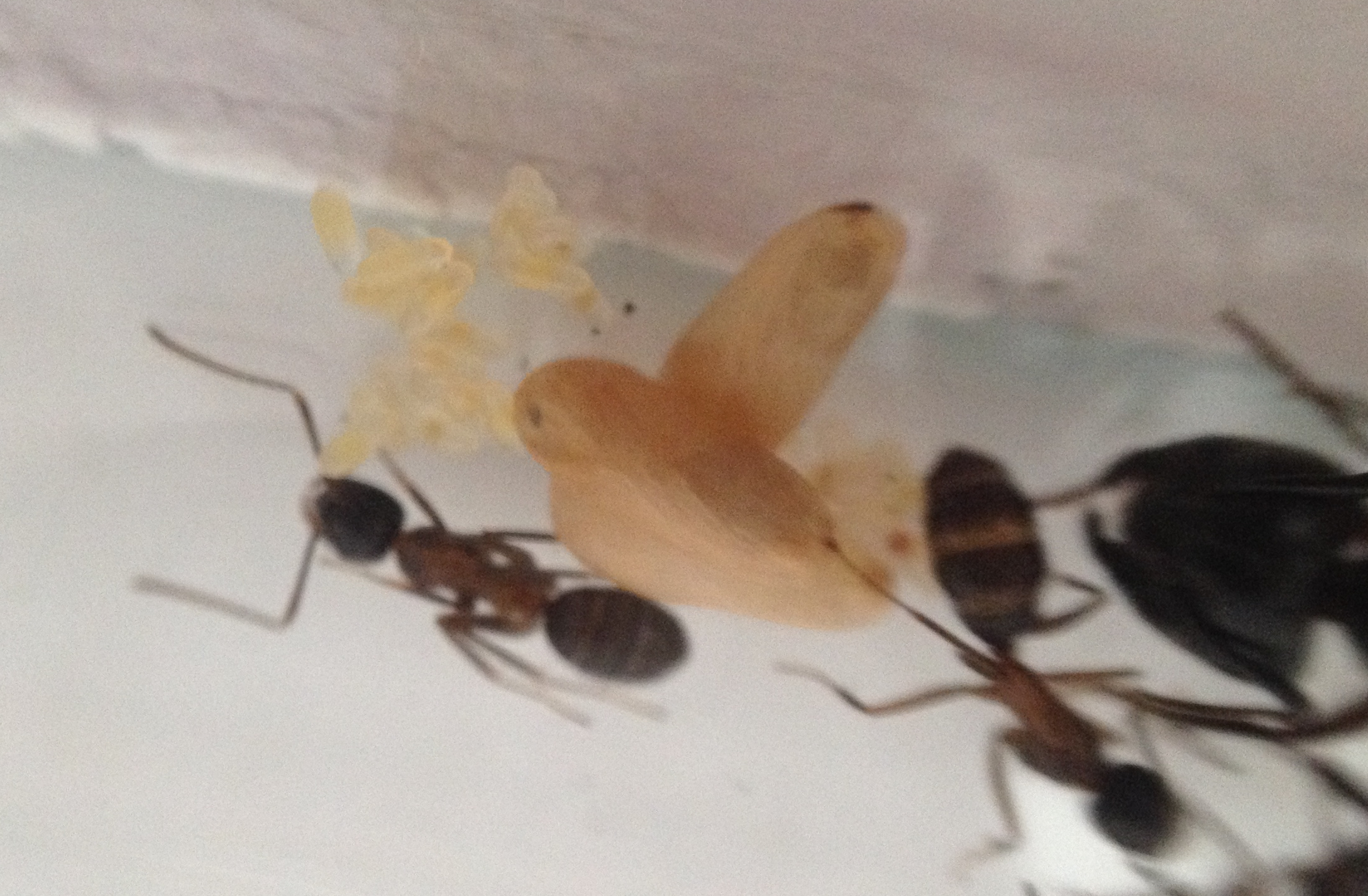 Interessant zu beobachten war, wie eine Arbeiterin alleine die ganze Brut in das neue Reagenzglas transportiert hat, während alle anderen "nichts" gemacht haben. Eine Arbeiterin wurde sogar an den Mandibeln gepackt und in das neue Reagenzglas rübergezogen :D (Sah echt brutal aus!)