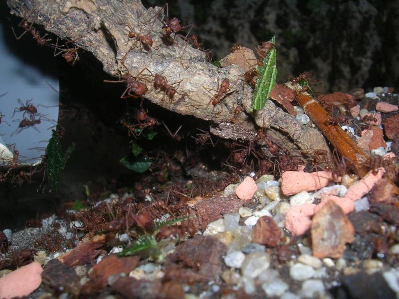 - Das war auch mal eine besondere Erfahrung. Oecophylla smaragdina sind imposante Tiere, sehr wiff und flink. Allerdings bekam ich eine Kolonie mit einer Gyne, deren meisten Beine fehlten, am Rücken lag, und daher nicht lange lebte. Da hatte ich wohl "die Katze im Sack" gekauft - die Kolonie kam in einem Blattnest ohne Einsicht.