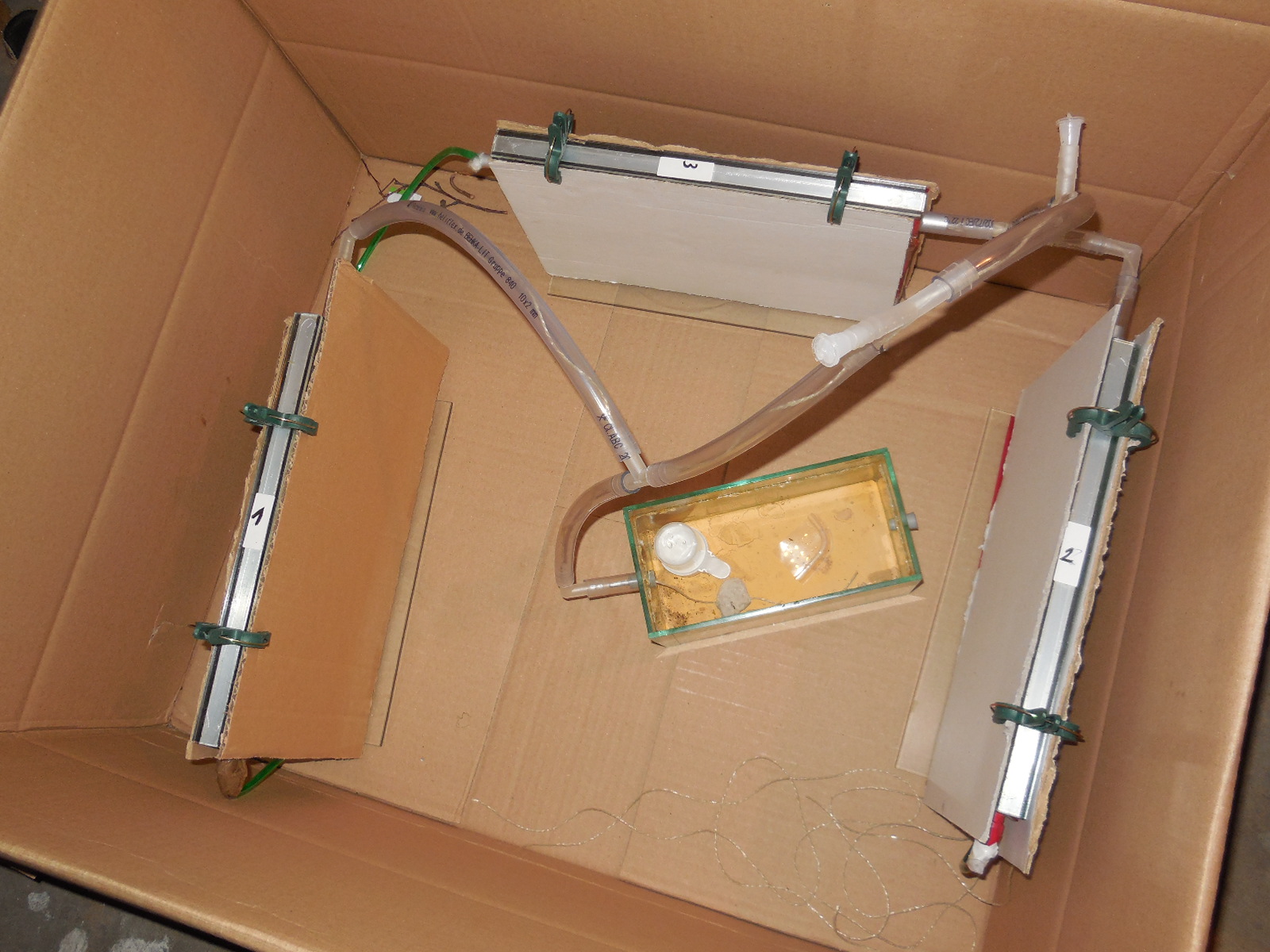 - Farm 3: enthält viel Substrat (dunkle Sand-/Lehmmischung). Die Farm ist sehr feucht, unten zeigen sich Tropfen am Glas. Hier halten sich nur wenige Tiere auf