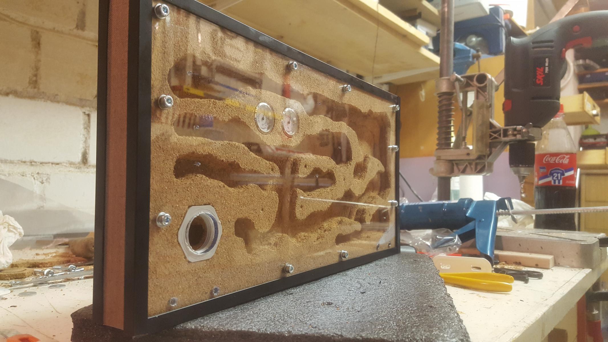 Auf den Bildern sieht man die mini Löcher an den wichtigsten Kammern, dort werde ich manuell jeden morgen mit einer Spritze ein paar tropfen rein laufen lassen. Aufgrund der Luftzirkulation wirds wahrscheinlich schwer die Feuchte zu halten, das Nest ist aussenrum komplett offen (Gaze), atmet also gut. Habe schon überlegt ob ich die Löcher mit abgestumpften Nägeln nach dem Bewässern dicht mache, muss ich austesten. Nest wird eh erstmal warm gelaufen jetz.