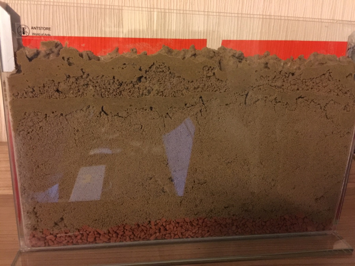 Auch das mit der Farm hättest du dir sparen können, Camponotus nicobarensis gräbt kaum, eher überhaupt nicht. Sie legen ihre Nester fast immer in schon vorhandenen Hohlräumen oder Totholz an. Falls du die Farm immer noch benutzen willst würde ich einen Y-tong Stein zuschneiden und dort reinstecken.