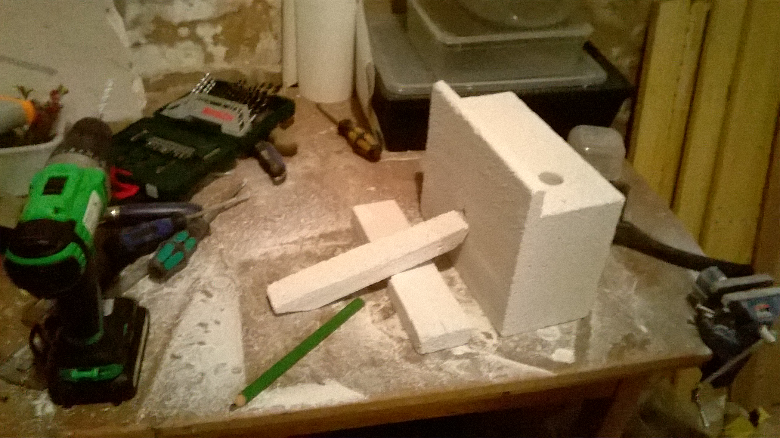 Material von dem Ding: Gasbeton, Gips (innen das Nest um die Poren zu verschliessen), Mörtel (Um die Kiesel und Steinchen zu befestigen), farbige Kiesel und Steinchen um Gras und Wasser ein wenig zu simulieren *g, Kunstpflanzen, Aquariensilikon, Abtönfarbe...naja das übliche halt.