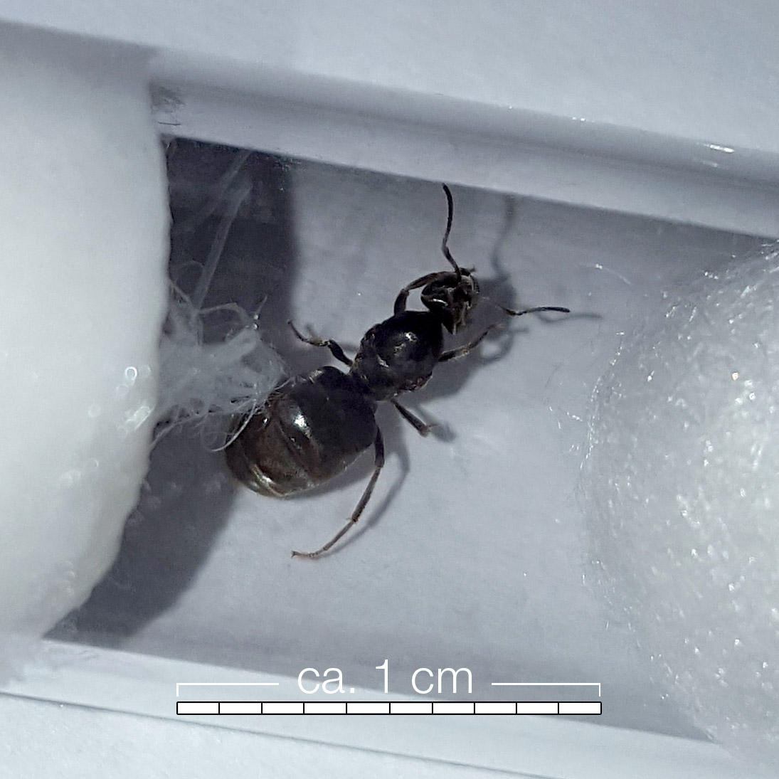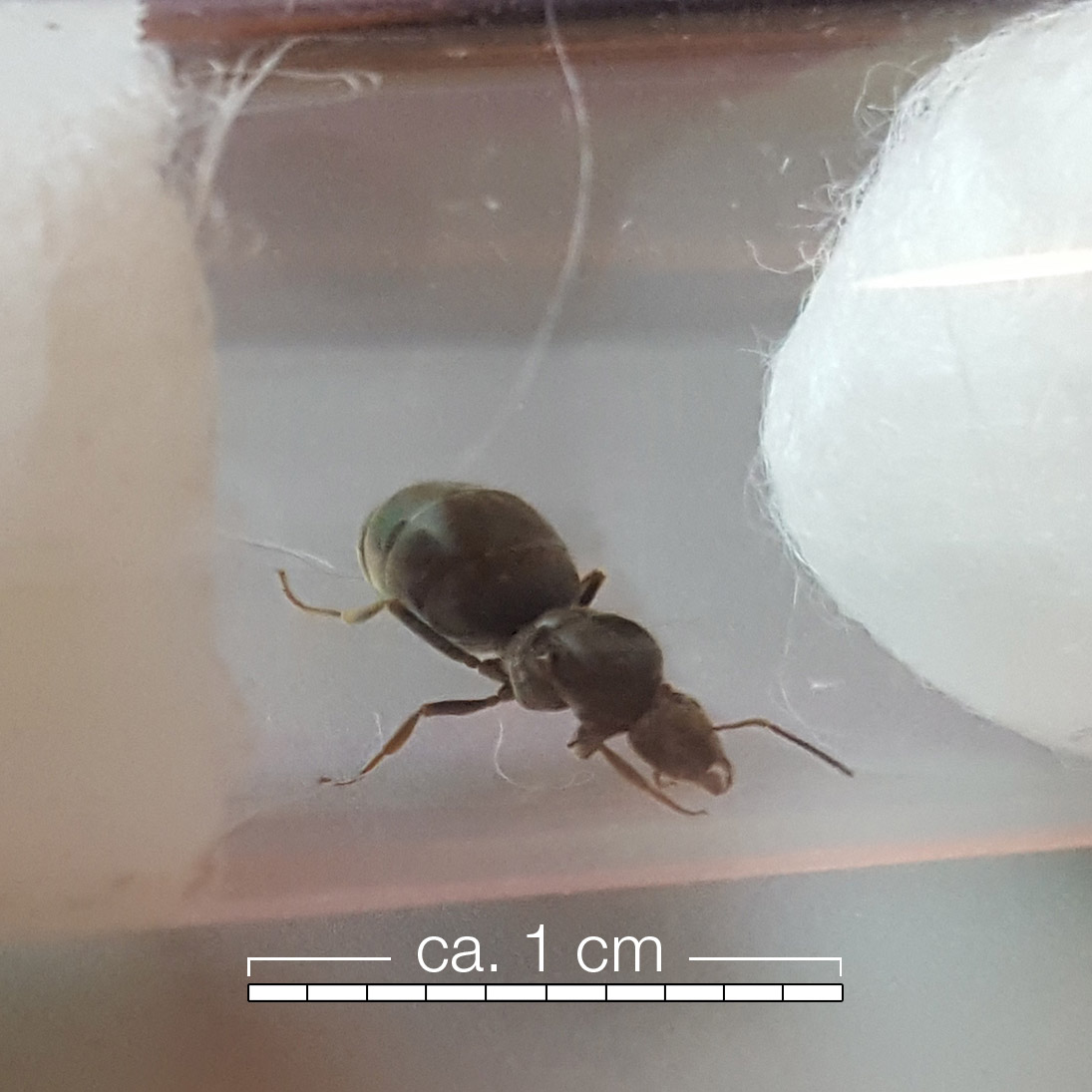 Eigentlich suche ich ja eine ganz andere Art, als mir diese Damen in Scharen vor die Füße liefen. Ich tippe mit meinem Anfängerwissen und aufgrund von Foto-Vergleichen, dem urbanen Setting (Straße und Innenhof) und der Tatsache, dass sie plötzlich überall auftauchten stark auf Lasius niger. Gefangen habe ich sie gegen 17:30 Uhr. Was meint ihr, liege ich da richtig?Ich habe zwei Exemplare mitgenommen. Beide Ladys waren während des kurzen Foto-Shootings relativ bewegungsfaul. Kann das normal sein? Oder kann ich das sogar als gutes Zeichen deuten, dass sie meine frechdreiste Ruhestörung nicht allzu sehr aus der Fassung gebracht hat? Würdet ihr mir empfehlen, ihnen einen winzigen Honigtropfen anzubieten?