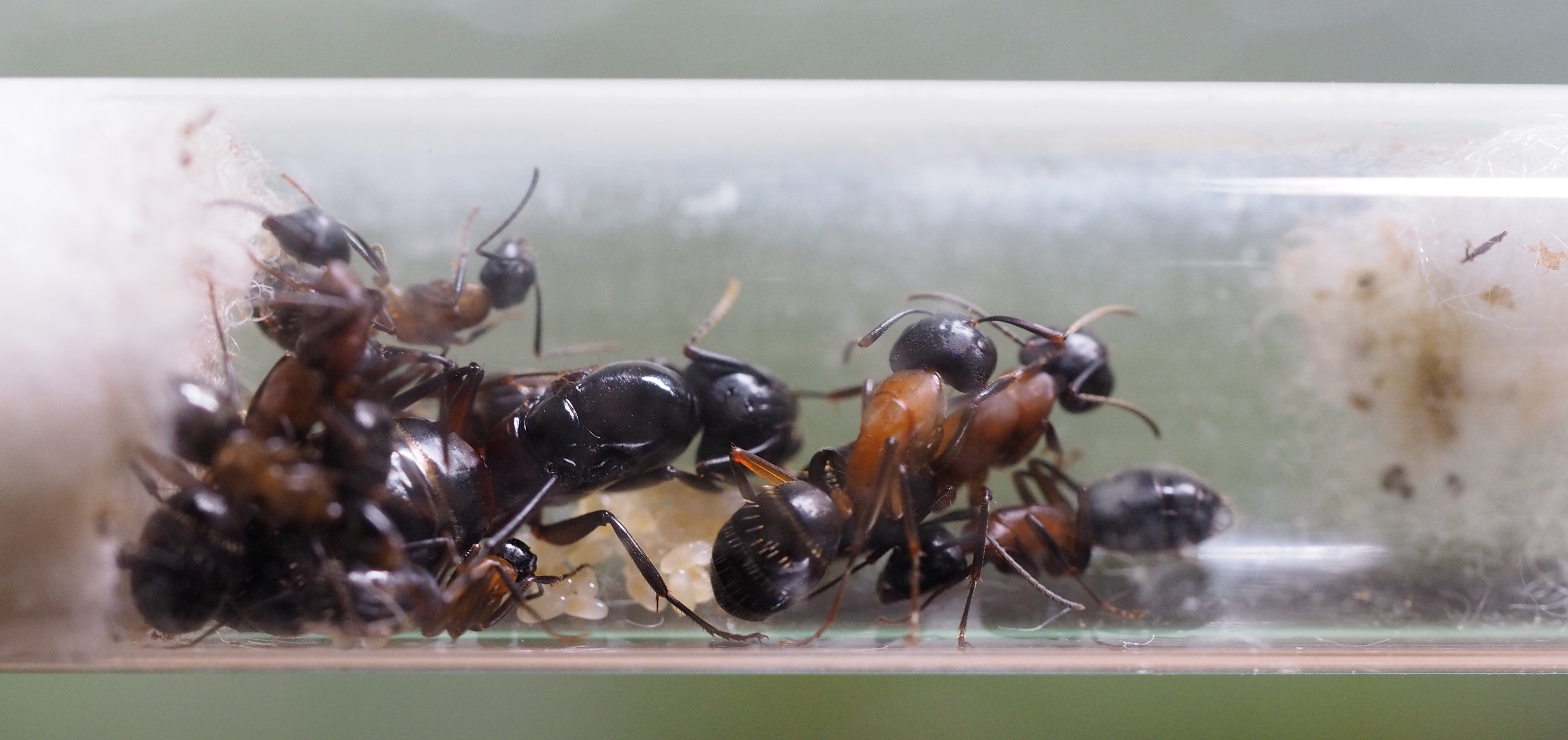 Das komische zittern/zucken ist wahrscheinlich Stridulation. Dabei reibt die Ameisen Körpersegmente aneinander um ähnlich wie Heuschrecken Zirpgeräusche zu erzeugen. Meine Camponotus barbaricus machen das recht selten, hab aber letztens im Wald Camponotus herculeanus beobachtet und bei denen scheint fast schon die primäre Kommunikationsform zu sein (v.a. im Eingangsbereich dient das vermutlich zur Identifikation).