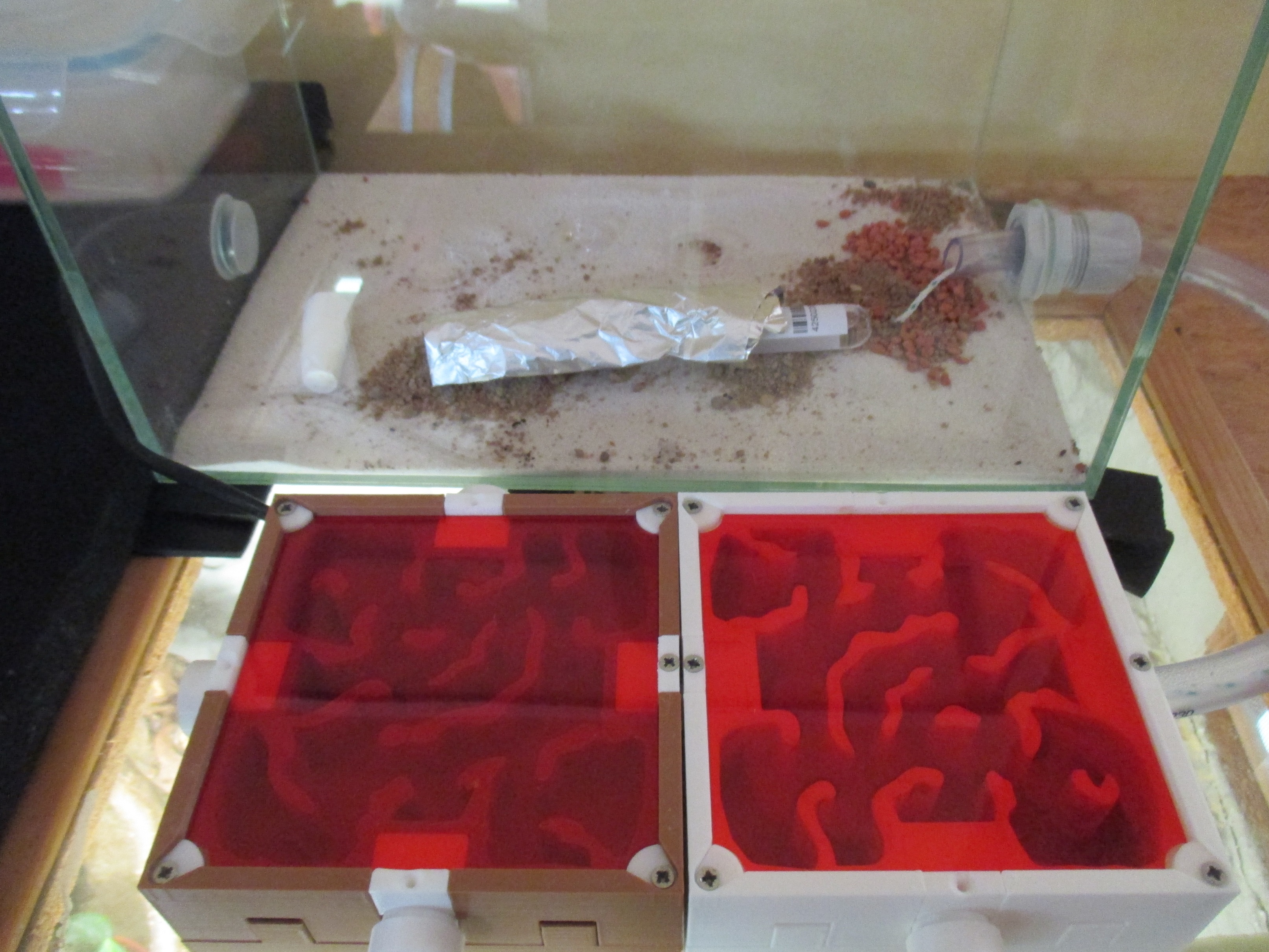 Als Nest habe ich ihnen angeboten 2x Sim-Ants Nest in S. Das rechte Nest, in welchem der Schlauch endet ist feucht, das linke ist komplett trocken. Beide sind innen mit einer Mischung aus Sand und Lehm angepinselt, damit die Ameisen mehr Grip haben und die Feuchtigkeit besser verteilt wird.