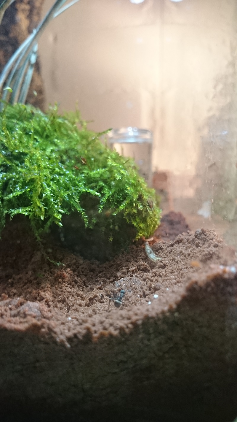 Es handelt sich um ein hohes Formicarium (20x20x40) mit Sand-Lehm-Gemisch. Die Einrichtung besteht aus aufgeschichteten, abgebackenen Rindenstücken und zwei, drei Ästen - das wars schon ;) Auf jeden Fall gibt es viel Lauffläche, was sicherlich nicht unwichtig bei dieser Art ist.