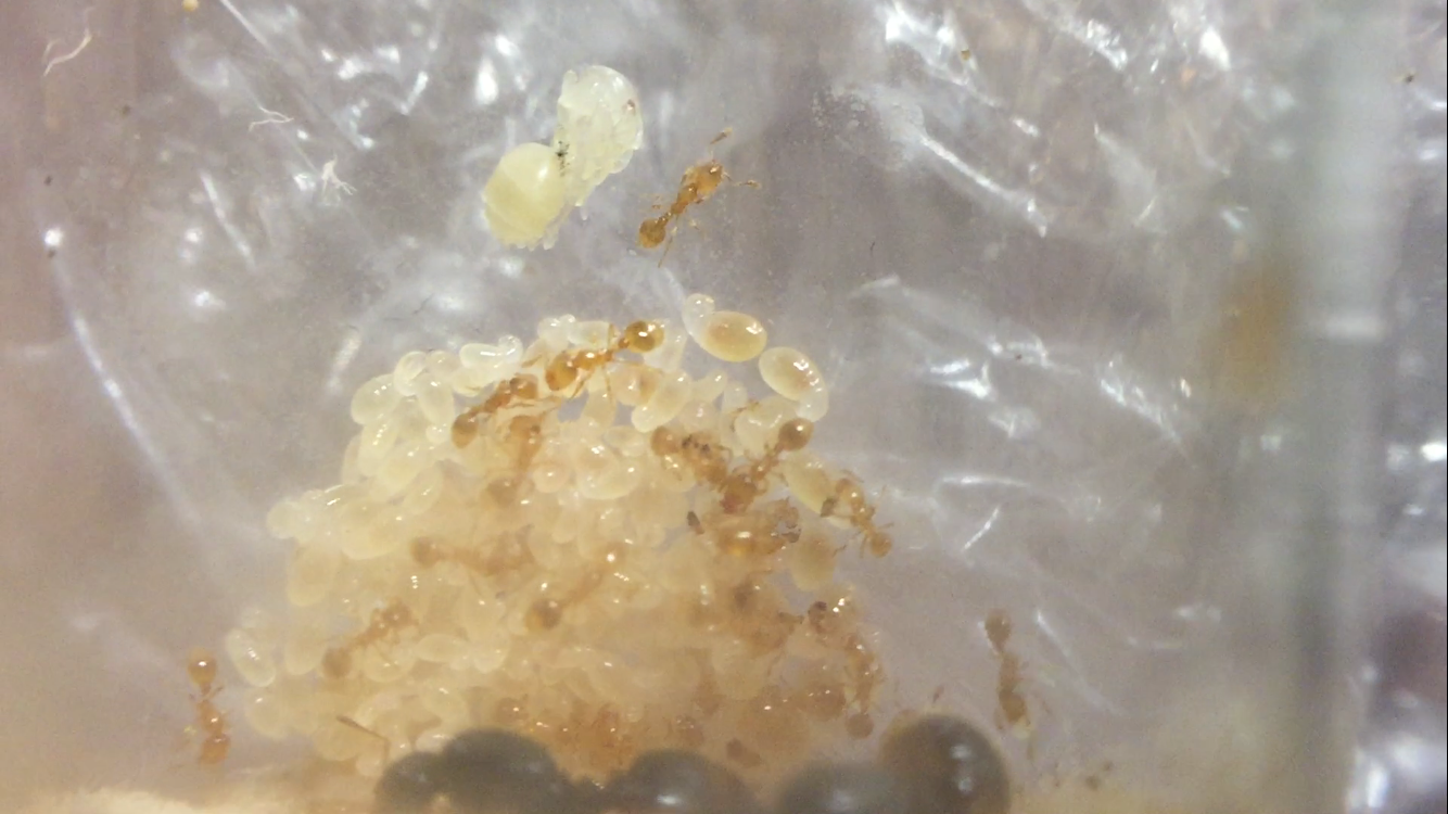 Die beiden gemeinsam grĂŒndenden Gynen vertagen sich nach wie vor super, und ihr Larvenberg ist, verglichen mit dem der Anderen, deutlich gröĂer.