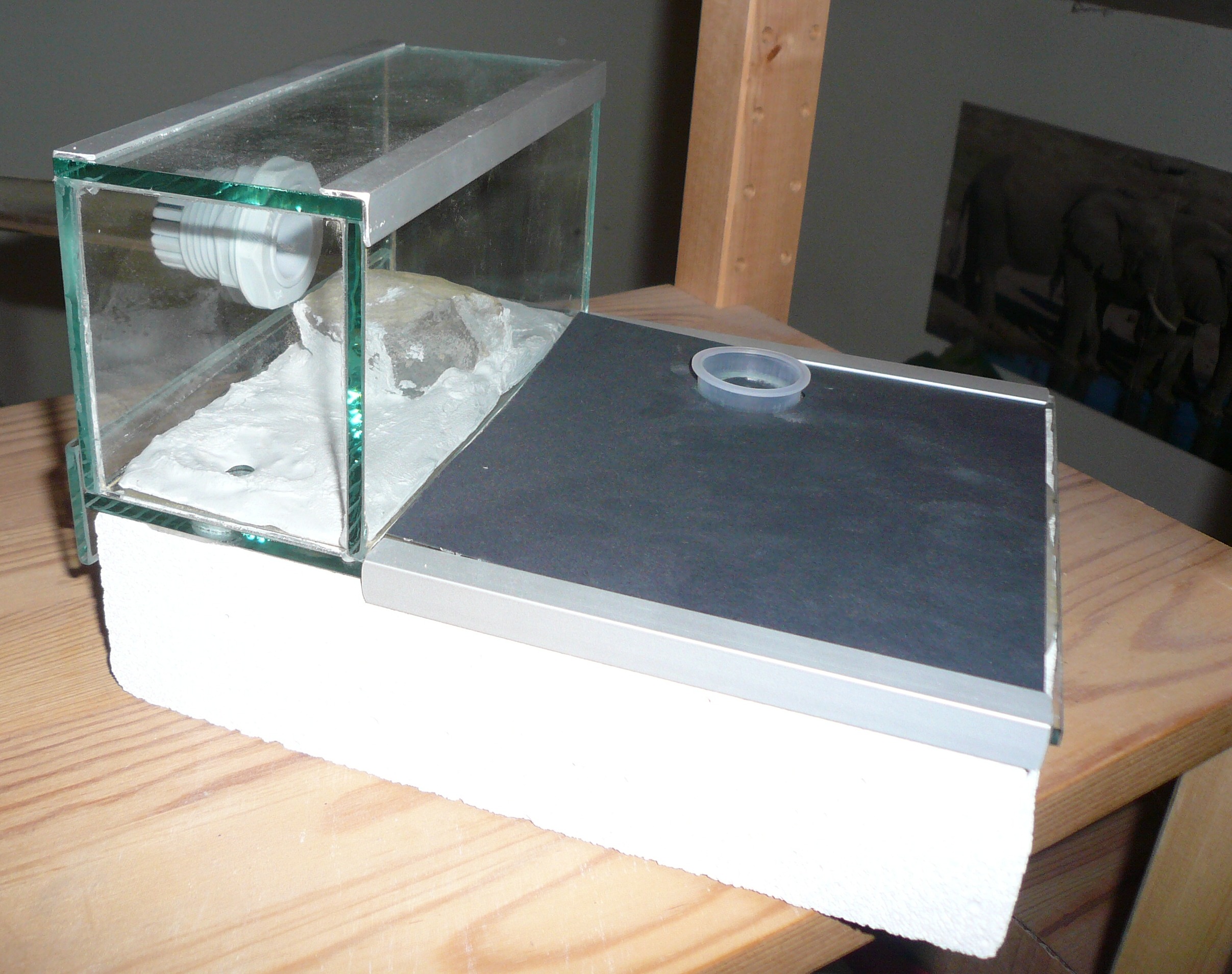 Dass die Glasplatte nur auf dem Ytong auflag ohne eine Dichtung dazwischen, schien mir riskant fĂŒr eine so kleine Art. Silikon auf den Ytong, Frischhaltefolie unter das Glas, beides aufeinanderdrĂŒcken, warten, perfekt angepasst. Dachte ich. Nachdem das Silikon getrocknet war, lieĂ sich das Glas einfach nicht mehr entfernen, trotz dazwischenliegender Frischhaltefolie. Erst nach einigem Gefluche und Gezerre gelang es. Ich habe einen zusĂ€tzlichen Gang gegraben, um auch die BewĂ€sserungskammer als Nest nutzen zu können, alle GĂ€nge vergröĂert und dann mit Gips wieder verkleinert (nicht ohne Kohlenstaub in den Gips zu mischen, um die hellen Meisen besser zu sehen) und schlieĂlich einen abhebbaren Arenaboden aus Gips beim dritten Versuch geschafft (so kann ich auch in die GĂ€nge unter der Arena einsehen).
